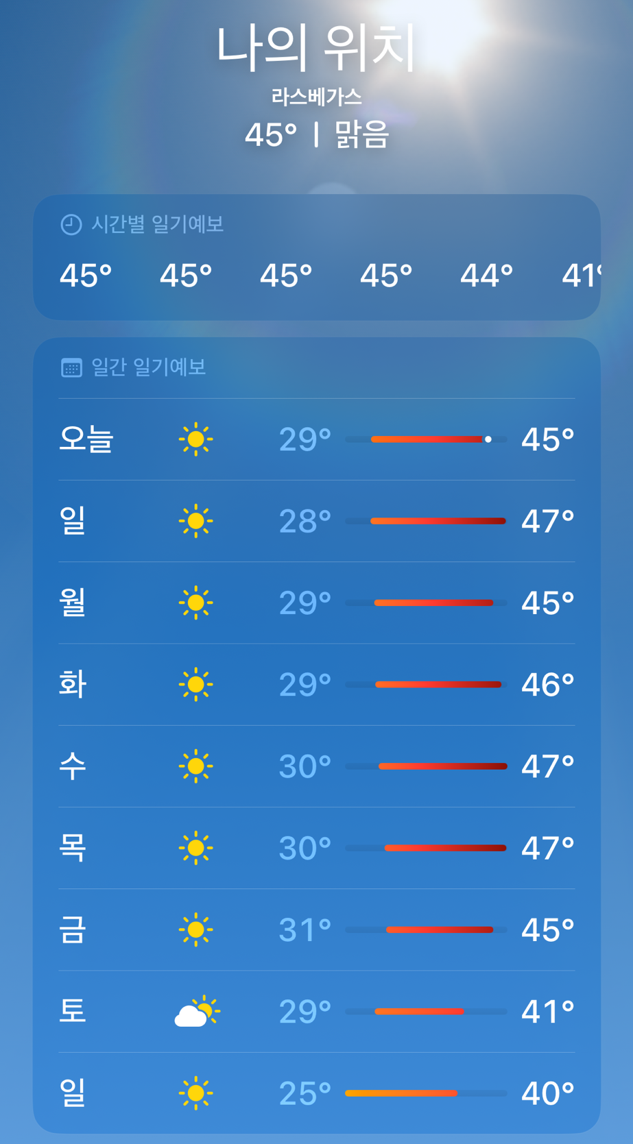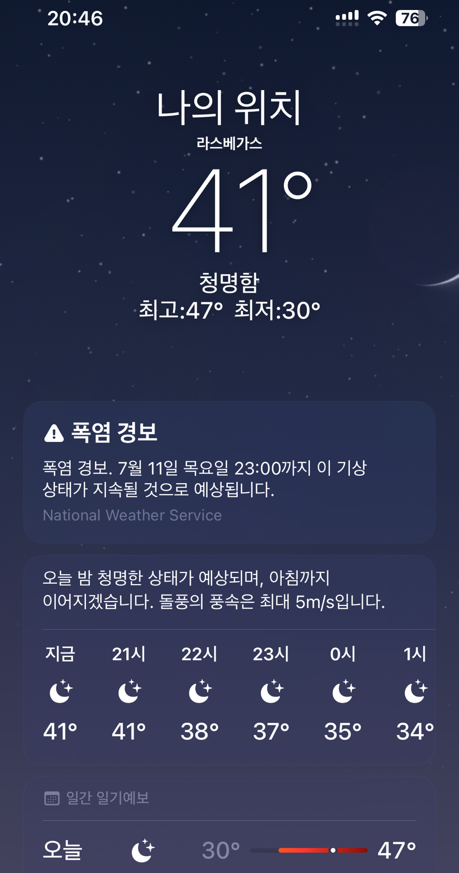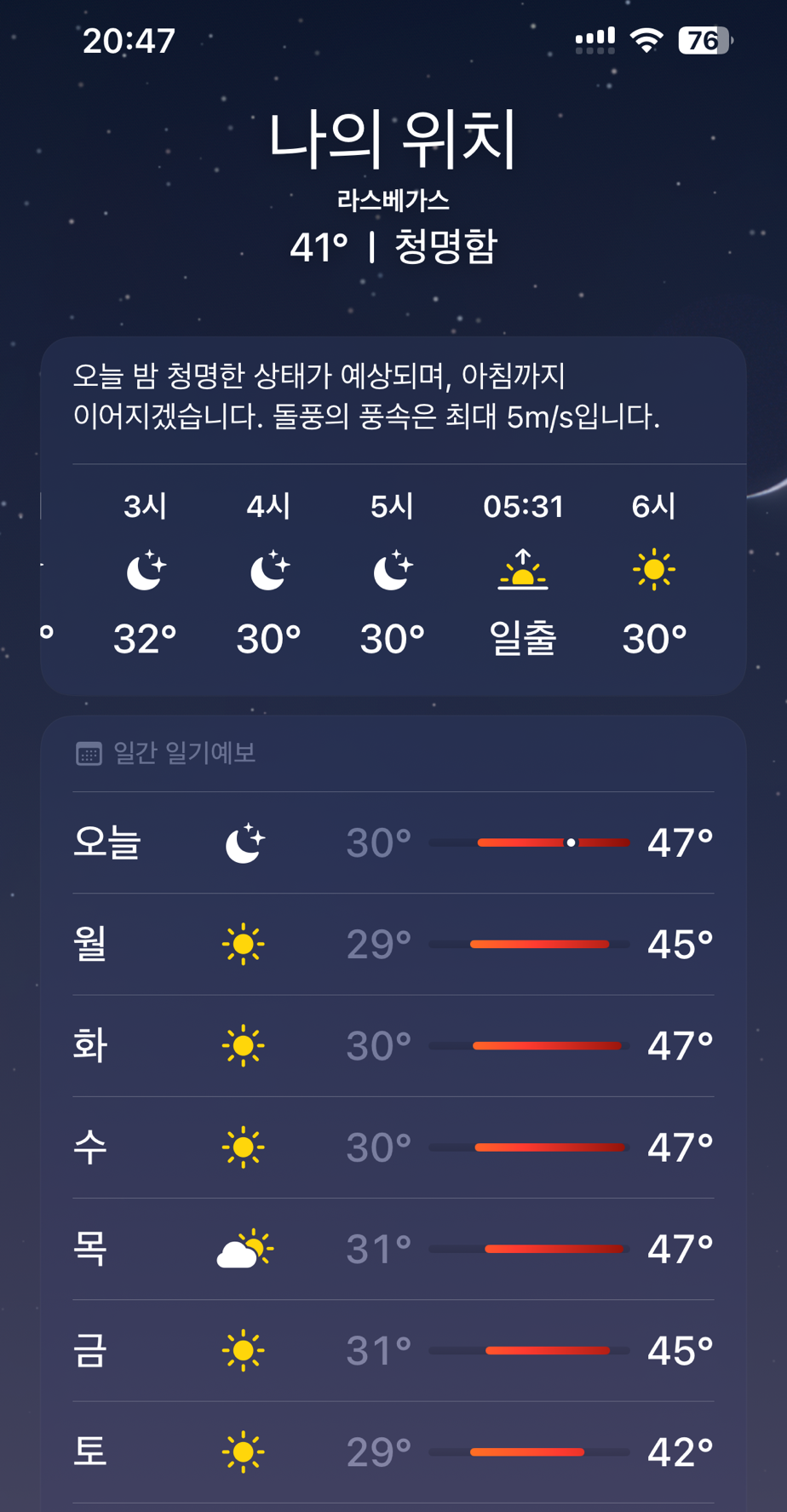 우리가 라스베이거스에 도착한 날짜가 2024년 7월 5일 저녁이다. 그리고 이틀뒤인 7월 7일, 라스베이거스의 최고기온 공식기록이 경신됐다고 한다. 120°F (약 48.9°C) 도를 찍으면서 이전 기록인 117°F도를 갱신했다고 한다. 믿을 수 없었다. 우리가 핸드폰으로 확인한 온도는 47도가 최고였다. 날씨어플에서 처음 보는 숫자에 당황했다. 그것도 연속해서 며칠 동안 내리 그 정도 기온이었다. 외출을 할 때마다 숨이 턱턱 막히는 한증막에 있는듯한 기분을 느꼈다.