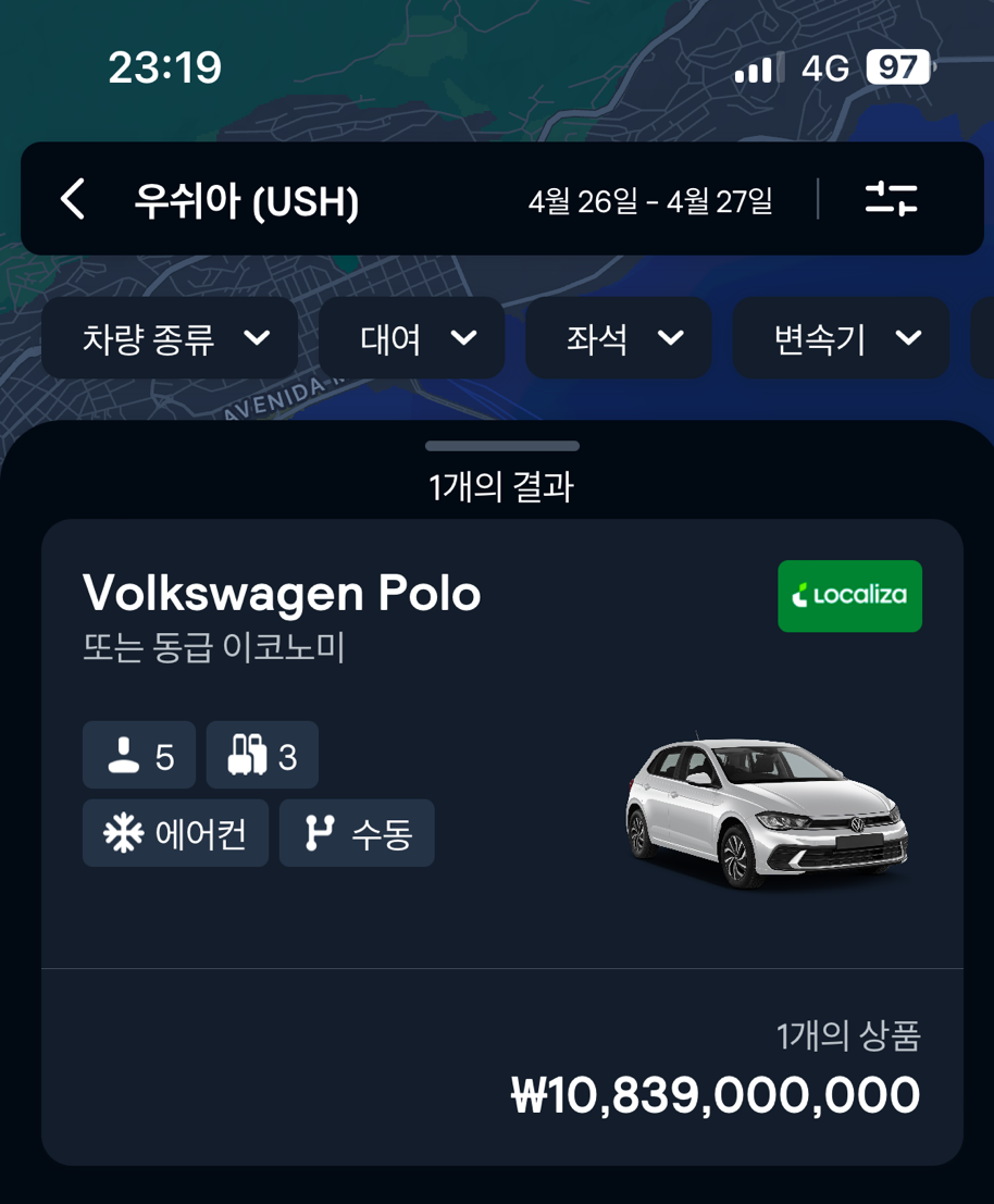 아르헨티나 우수아이아에서 차를 렌트하기 위해 알아보던 중이었다. 구글에서 해당지역 렌트를 치면 렌탈스닷컴 같은 렌탈 비용을 비교해 볼 수 있는 업체들을 확인할 수 있다.