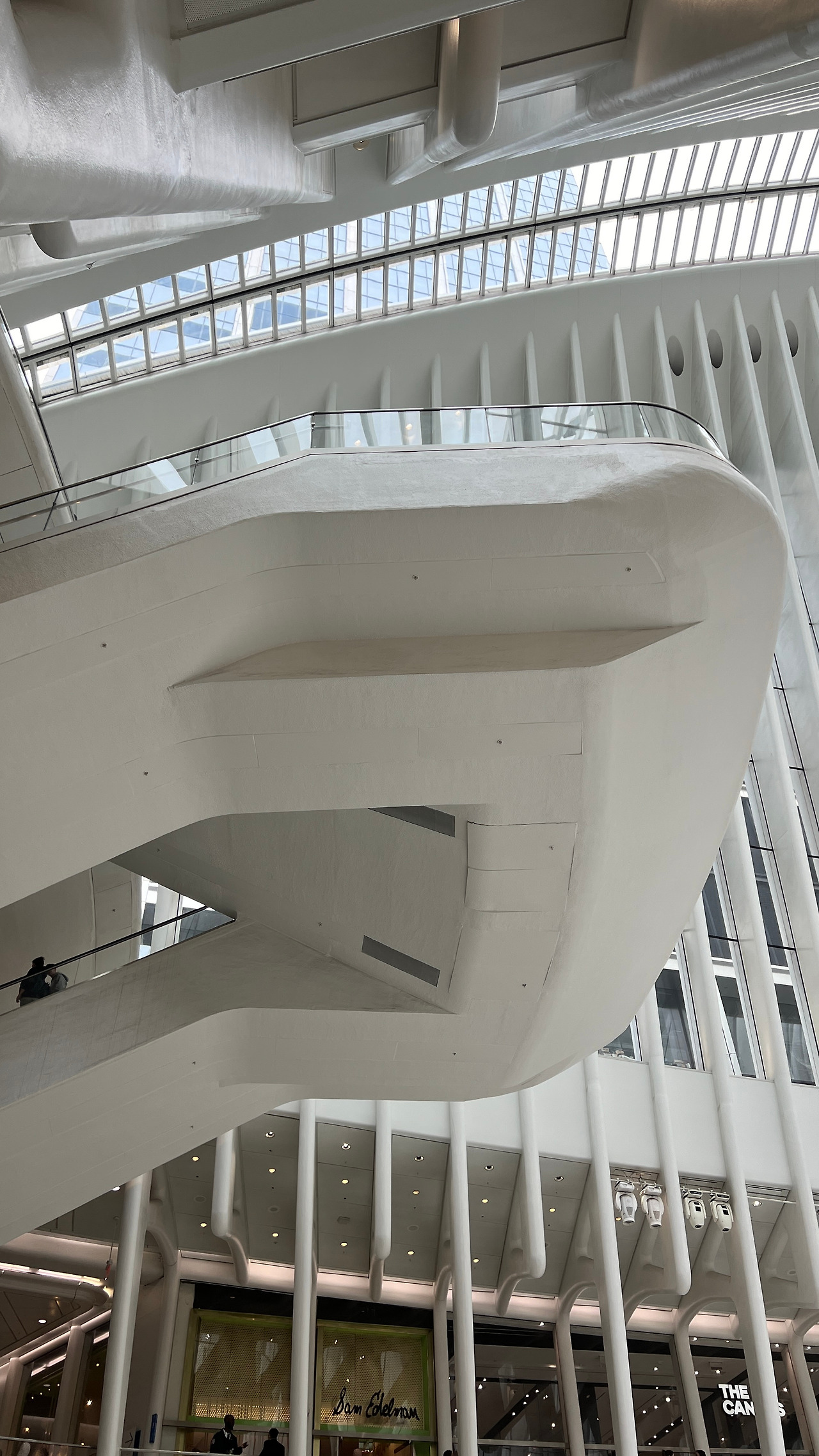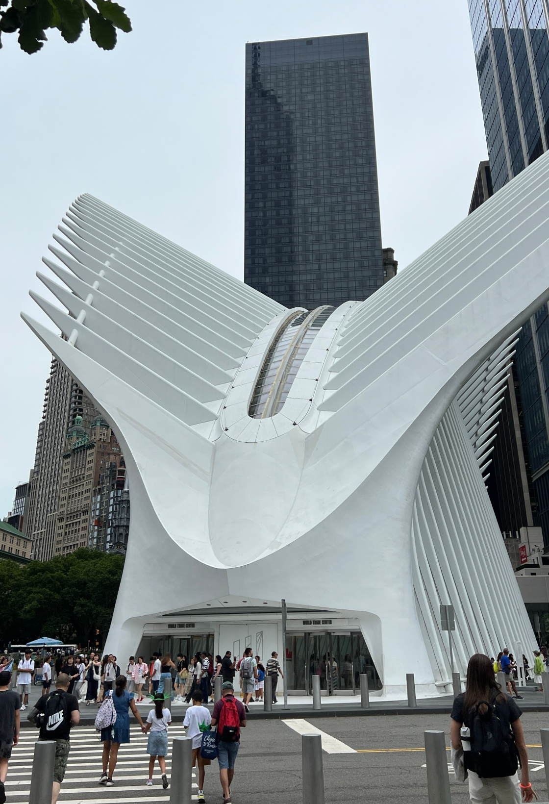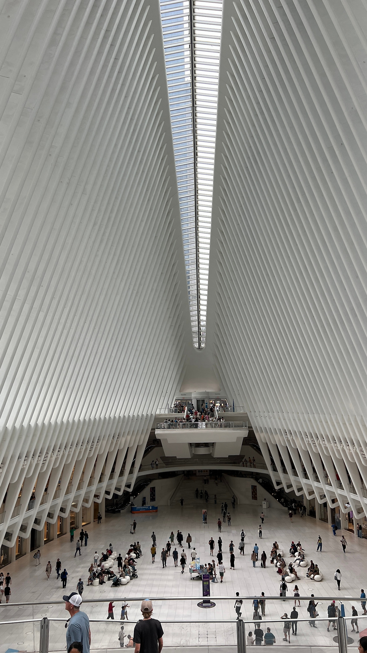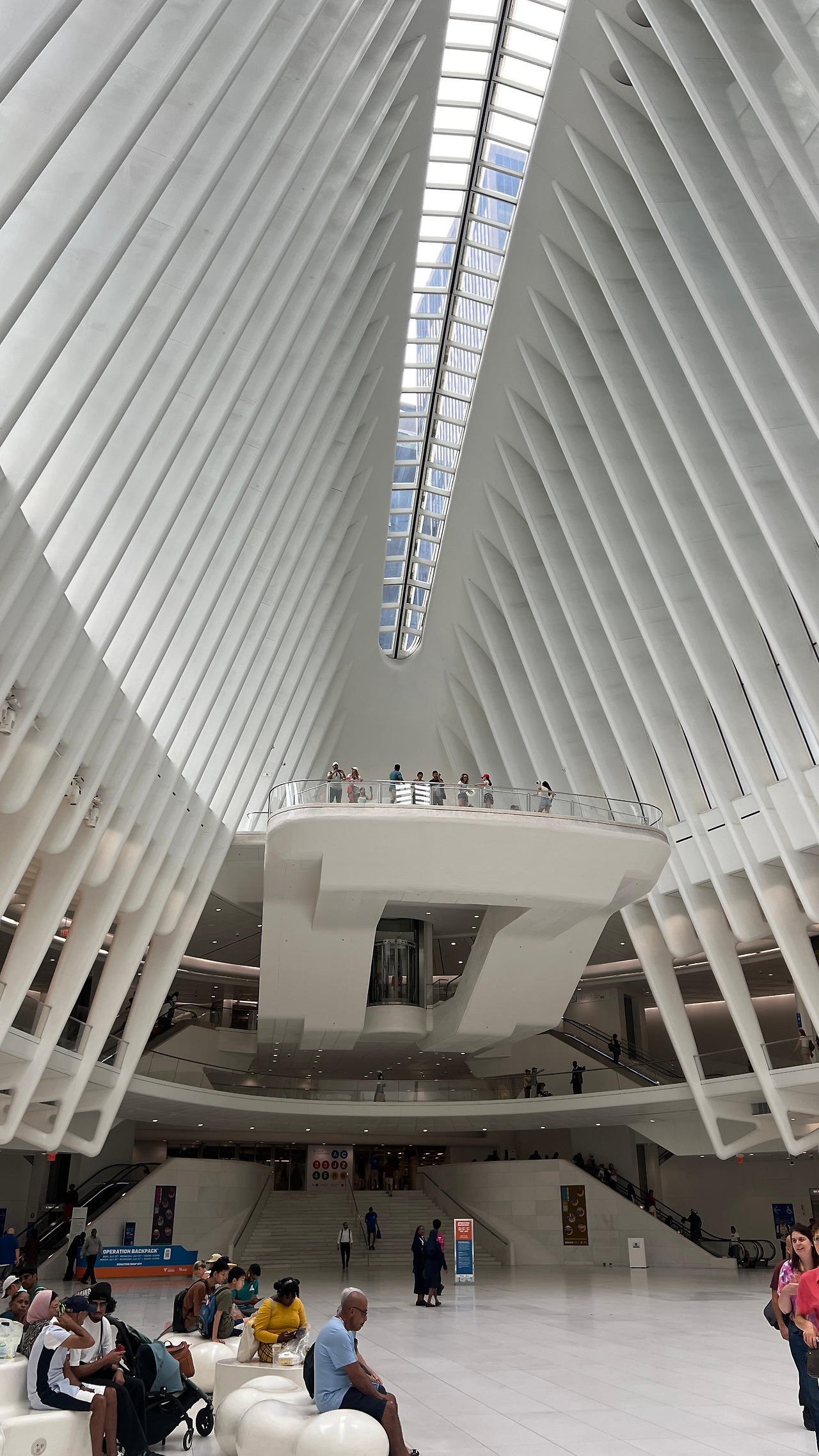 건물 외형이 하얀 새가 날개를 펼치며 날아오르는 모습을 형상화했다고 한다. 9·11 테러 당시 무너진 구 세계무역센터 자리와 연결되는 공간이라, “재탄생”과 “희망”을 상징하는 곳으로, 뉴저지 PATH 열차, 뉴욕 지하철 여러 노선과 연결되어 있고 웨스트필드 월드 트레이드 센터 쇼핑몰(Westfield WTC Mall)이 들어서 있어, 명품 브랜드와 레스토랑이 입점해 있다. 단순한 교통 시설을 넘어서 관광 명소 + 쇼핑 공간 역할을 동시에 하고 있었다.