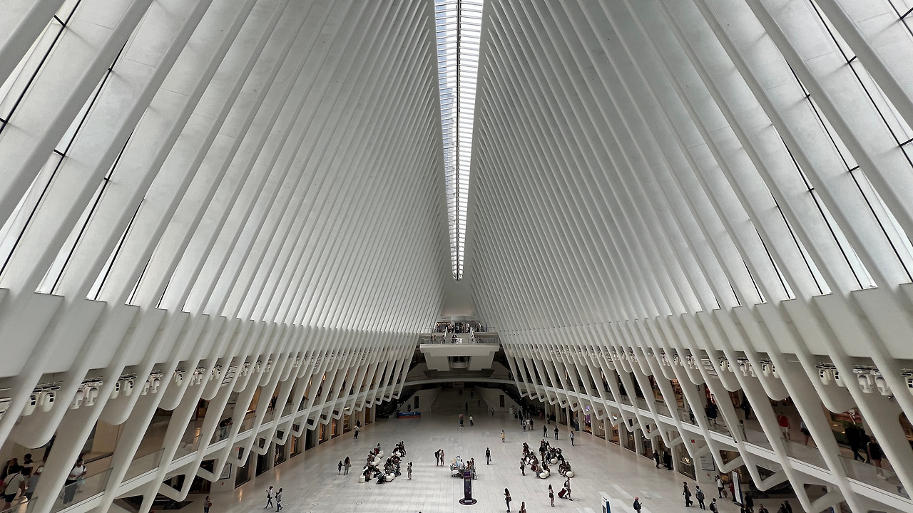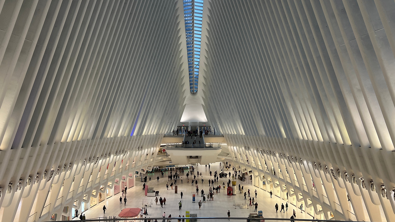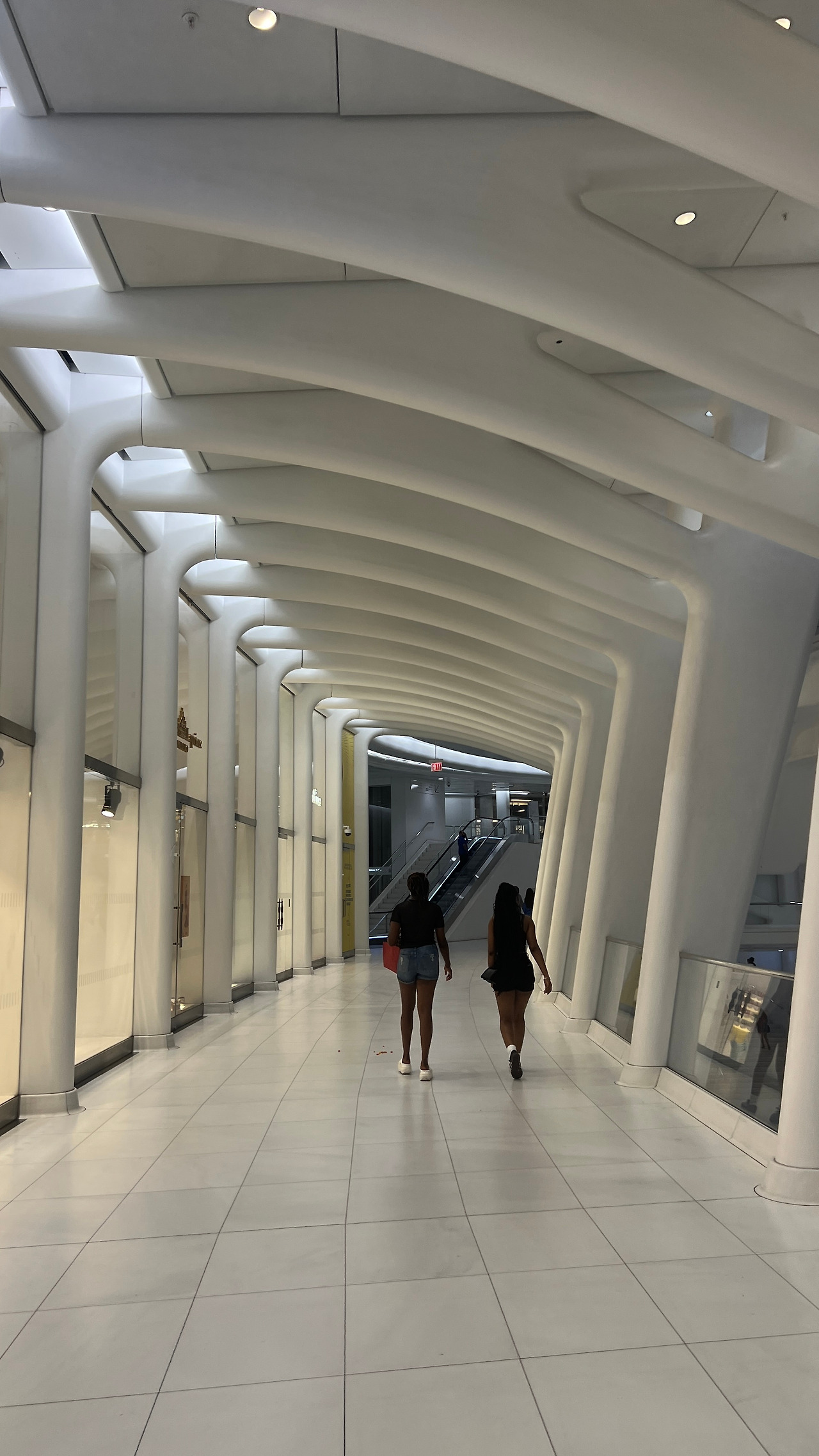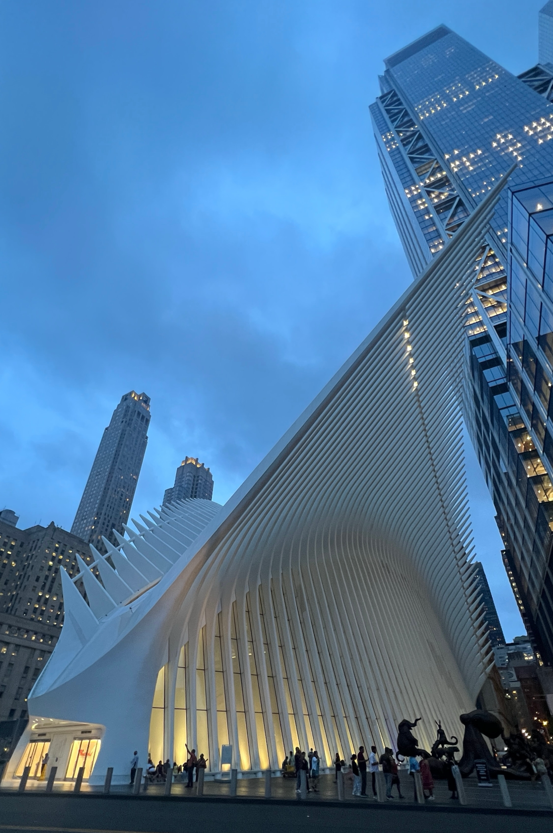 건물 외형이 하얀 새가 날개를 펼치며 날아오르는 모습을 형상화했다고 한다. 9·11 테러 당시 무너진 구 세계무역센터 자리와 연결되는 공간이라, “재탄생”과 “희망”을 상징하는 곳으로, 뉴저지 PATH 열차, 뉴욕 지하철 여러 노선과 연결되어 있고 웨스트필드 월드 트레이드 센터 쇼핑몰(Westfield WTC Mall)이 들어서 있어, 명품 브랜드와 레스토랑이 입점해 있다. 단순한 교통 시설을 넘어서 관광 명소 + 쇼핑 공간 역할을 동시에 하고 있었다.