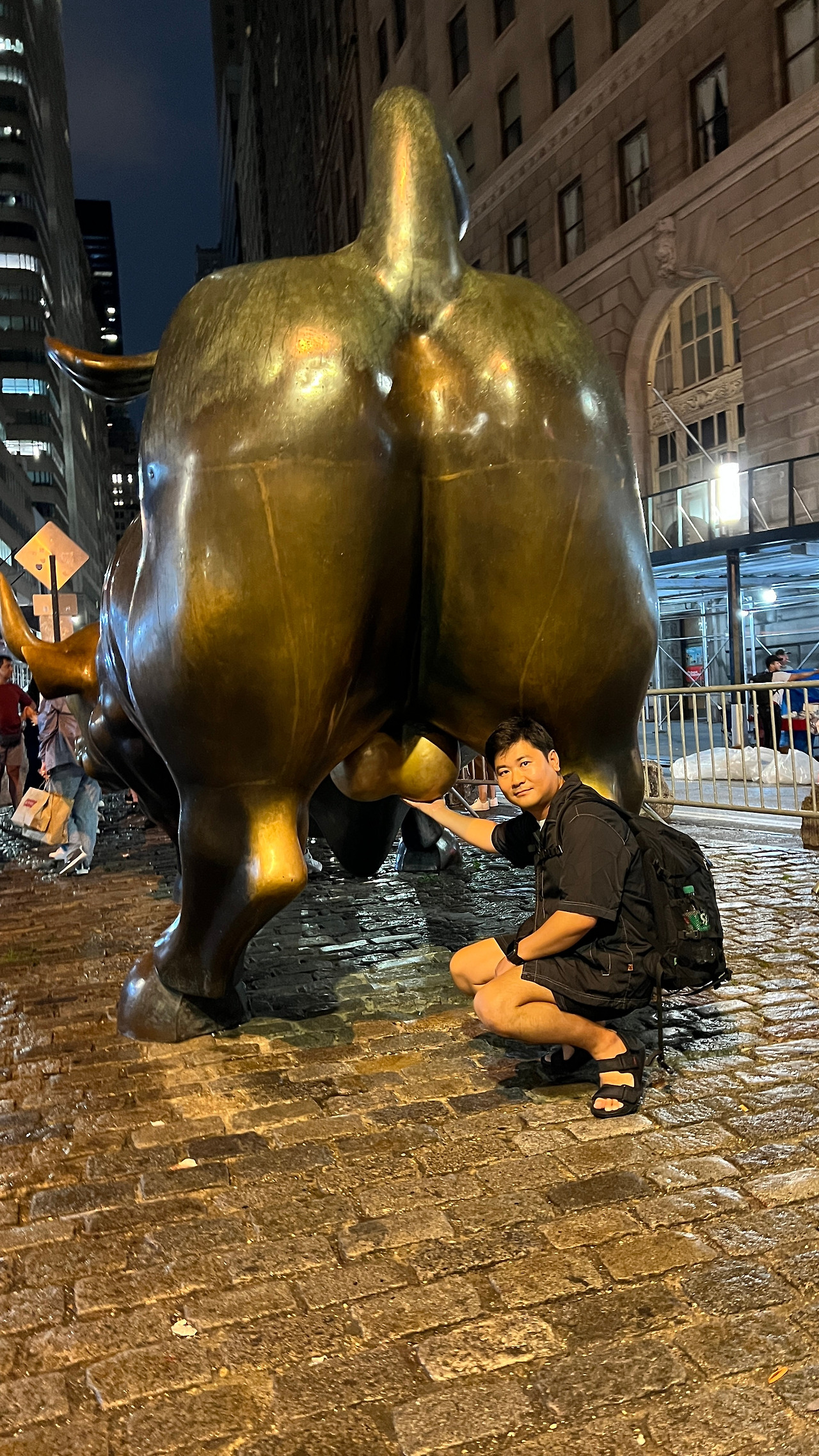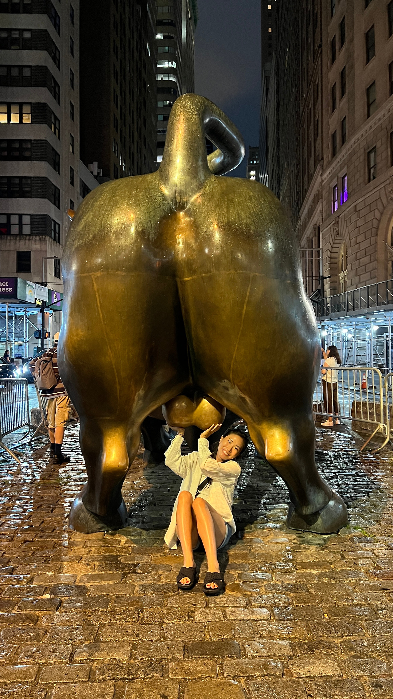 뿔을 만지면 행운, 불알(?)을 만지면 재물운이 온다는 속설 덕분에 유명한데, 부자가 되기 위한 사람들이 찾는 관광명소이다. 밤 9시에 비까지 내리는데도 사진을 찍기 위한 줄이 있었다. 줄을 서서 기다렸다가 우리 차례가 되어 소중히 받치고 사진을 찍었다. 참 민망했다.
