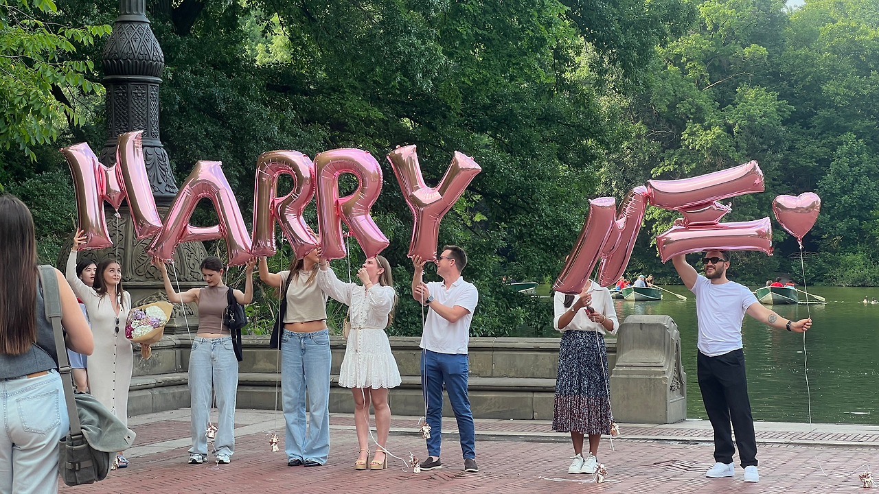 여유로운 풍경 속에 누군가 프로포즈를 하고 있었다. 앉아서 주인공들이 나타나길 기다리는데 하늘로 풍선하나가 날아간다. 친구 중 한 명이 다급히 쫓아갔지만 이미 잡을 수 없을 만큼 높이 놀라갔다. 다행히 자유를 찾아 떠난 알파벳 E를 대신할 M이 하나 더 있었던 모양이다. 완성된 메리 미를 보며 구경하던 이들 모두 안도했다.