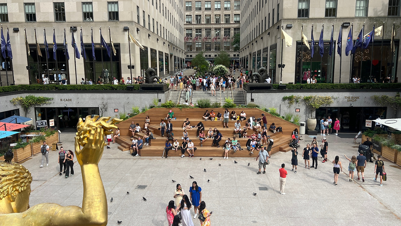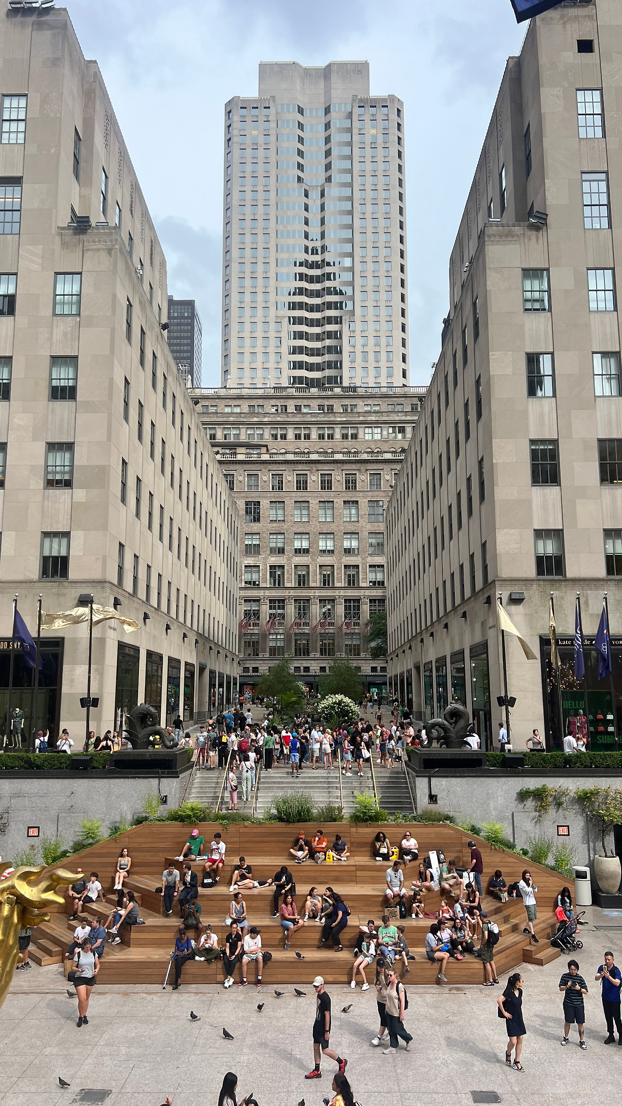 맨해튼 미드타운 한복판에 자리 잡고 있는 록펠러센터에 왔다. 크리스마스 시즌에 커다란 초대형 트리와 아이스링크가 설치되어 유명한 곳이다. 뉴욕의 크리스마스를 상징하는 장면으로 영화와 드라마에 자주 등장했던 곳인데 우리가 갔던 여름에는 나무 데크 의자가 설치되어 사람들이 쉴 수 있는 공간이었다.