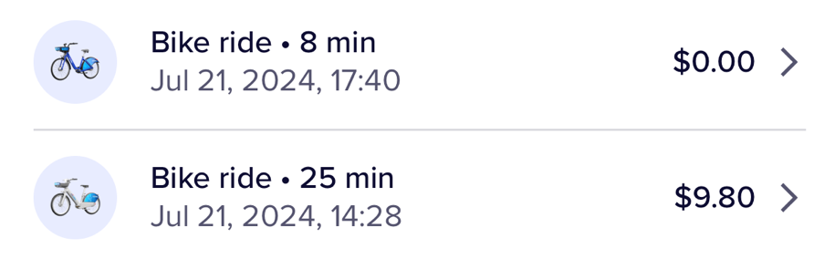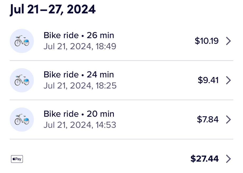 아주 신나게 라이딩을 즐긴 후 바이크를 파킹하고 등록해 놓은 카드에서 빠져나간 금액을 확인했다가 깜짝 놀랐다. 21일 하루에만 다 합쳐서 37.24달러가 결제 됐다. 한화로 오만 원이 넘는 금액이다. 한 시간 40분 이용에 둘이 합쳐 십만 원이 넘게 나왔다.