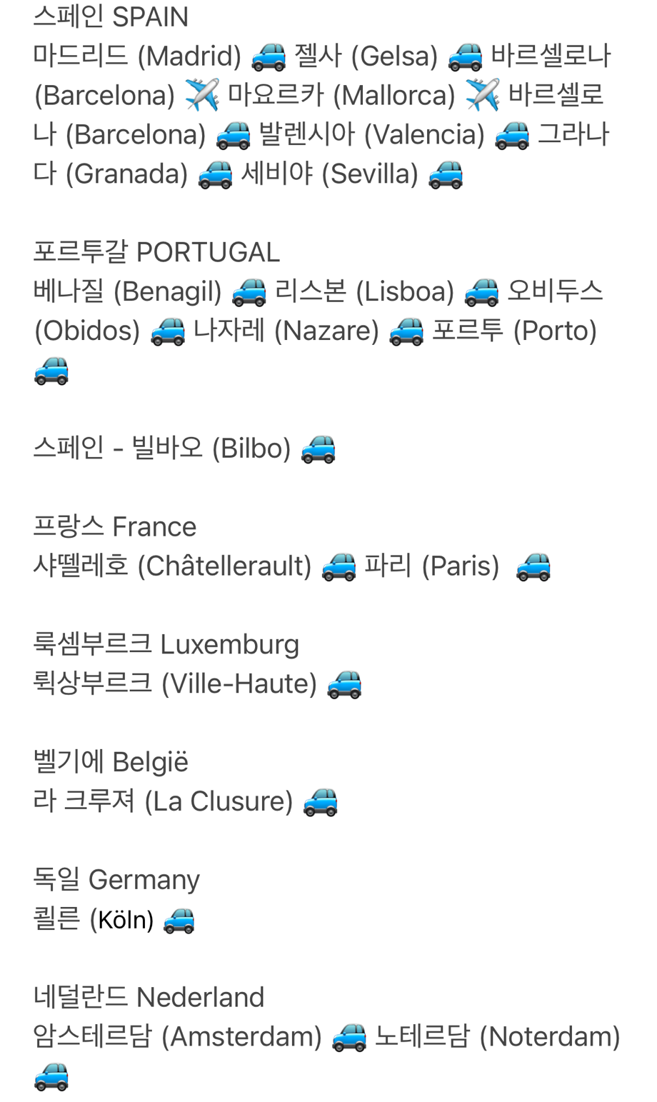 유럽 내에서의 동선은 스페인 마드리드부터 시작했다. 시계방향으로 포르투갈까지 돌고 프랑스로 올라갔다. 북쪽으로 올라가 네덜란드를 지나 덴마크까지 갔다가 체코와 헝가리가 있는 동유럽 쪽으로 갔다. 알프스가 걸쳐져 있는 오스트리아와 프랑스, 스위스, 이탈리아를 여행하고 다시 프랑스 파리로 가서 아이슬란드로 아웃했다. 우리의 마지막 여행은 영국이었다.