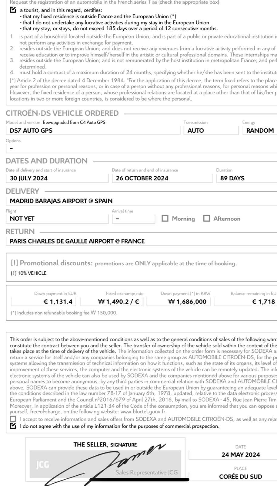 편하게 카톡으로 운전면허증과 여권을 사진 찍어 보내고 집주소와 카드정보를 알려주면 시트로엥 코리아 직원분이 본사에 계약 접수를 진행하는 시스템이다. 계약금 40%를 입금하면 계약이 완료된다. 잔금은 픽업일 한 달 전에 그 당시의 환율로 계산된다.