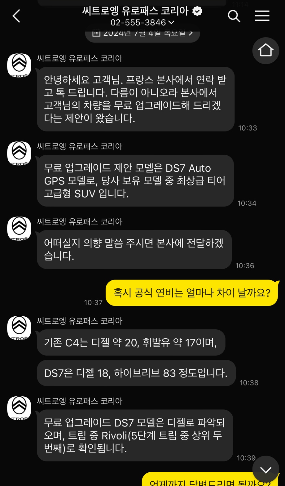 직접 TT Car사이트에서 받은 견적과 카톡에서 시트로엥 유로패스 코리아에서 받은 견적이 얼마 차이가 나지 않아서 한국말로 편하게 안내받고 궁금한 것을 질문하기 위해서 카톡으로 신청하게 되었다.