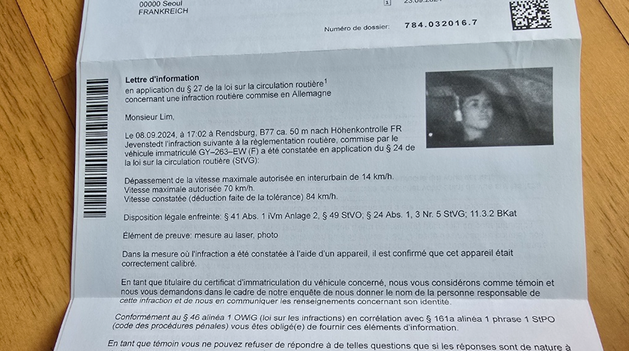 얼마 지나지 않아 독일에서 날아온 고지서 한 장을 서울의 엄마한테 또 받았다. 와이프가 잠깐 운전을 한 적이 있었는데 70km 도로에서 84km로 달려 40유로의 벌금이 나왔다. 독일에서 저 구간은 얼굴 사진도 찍어준다. 우리 엄마가 농담으로 며느리 얼굴을 이렇게라도 봐서 좋긴 하다고 하셨다.