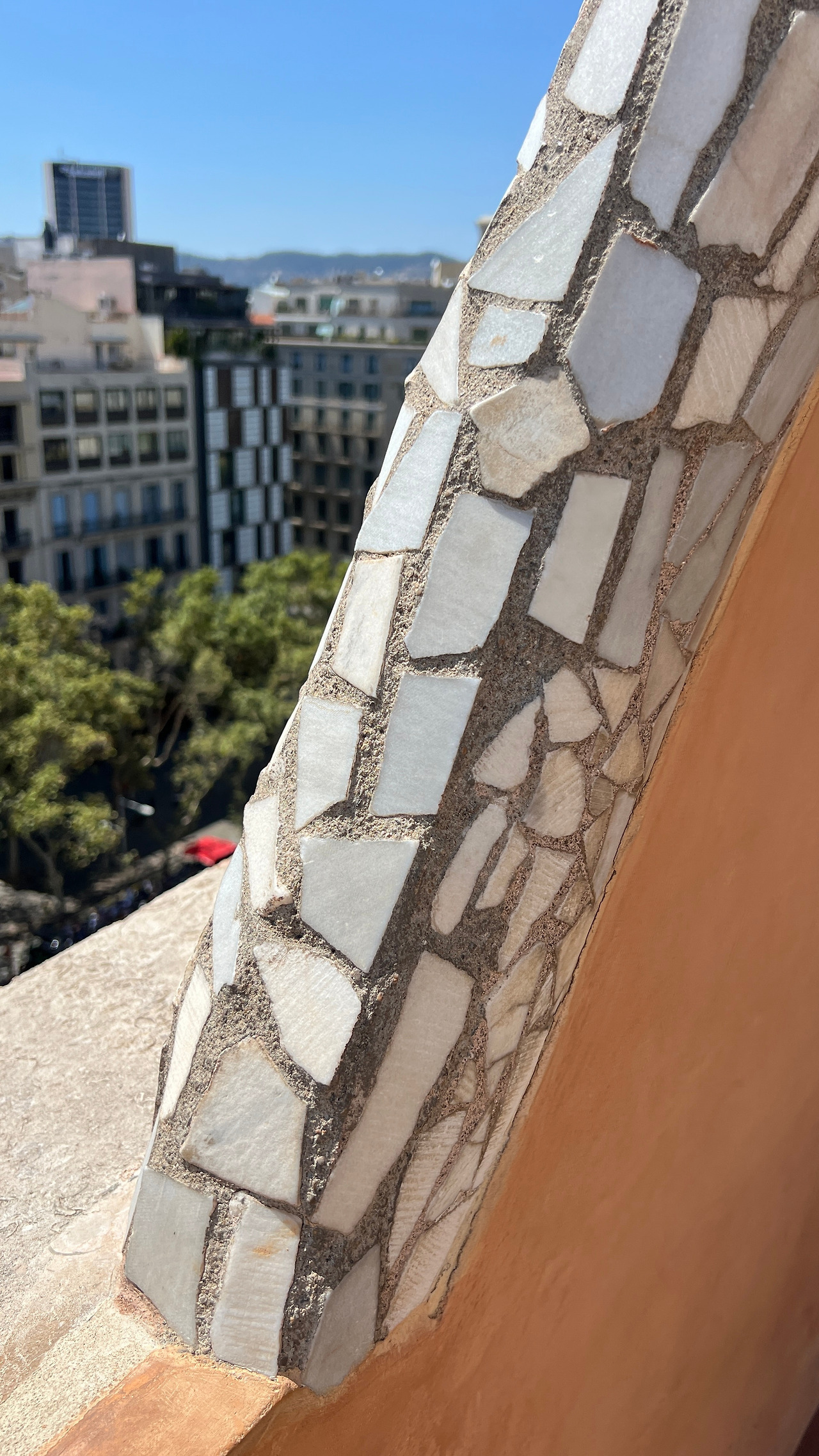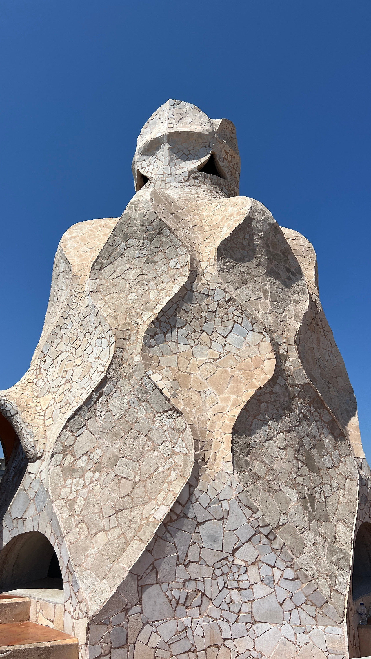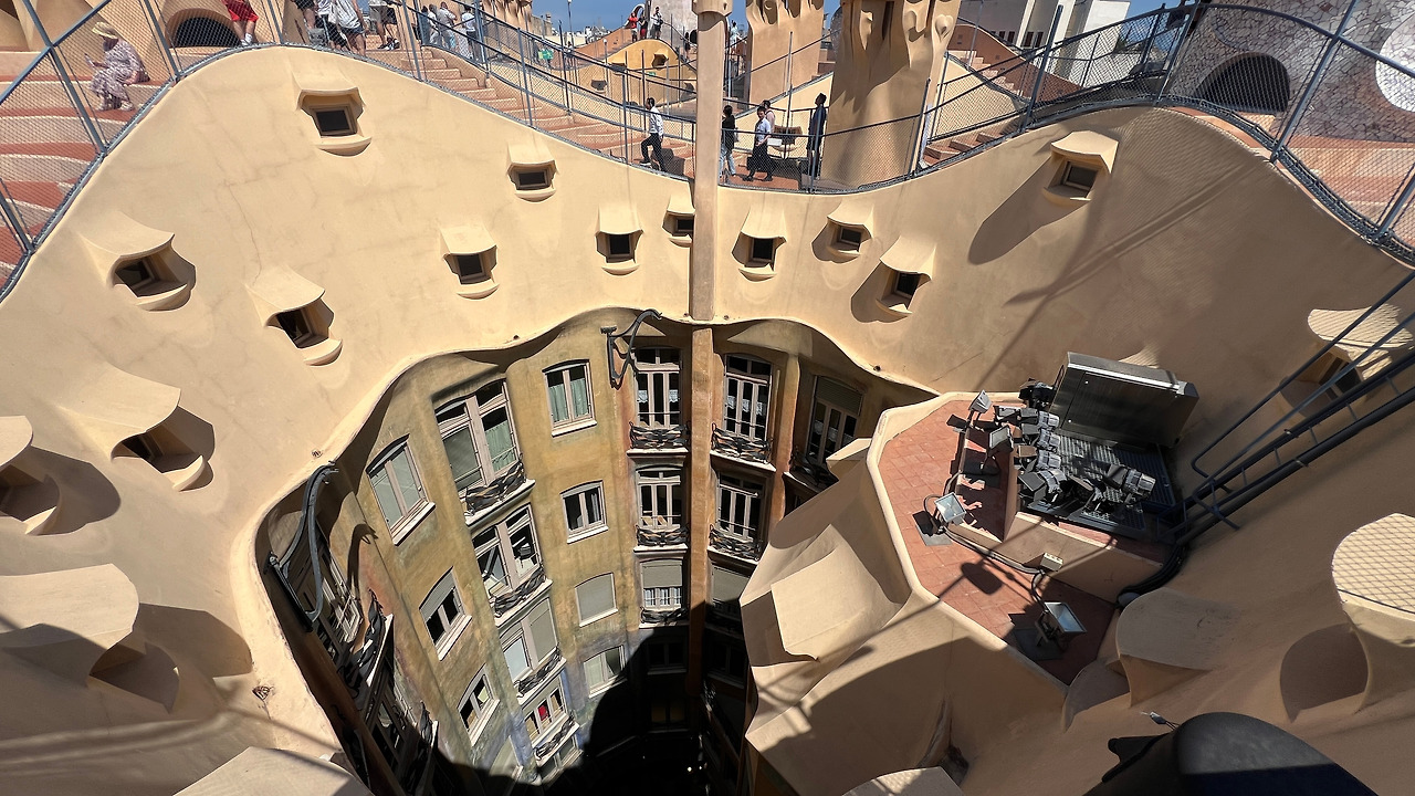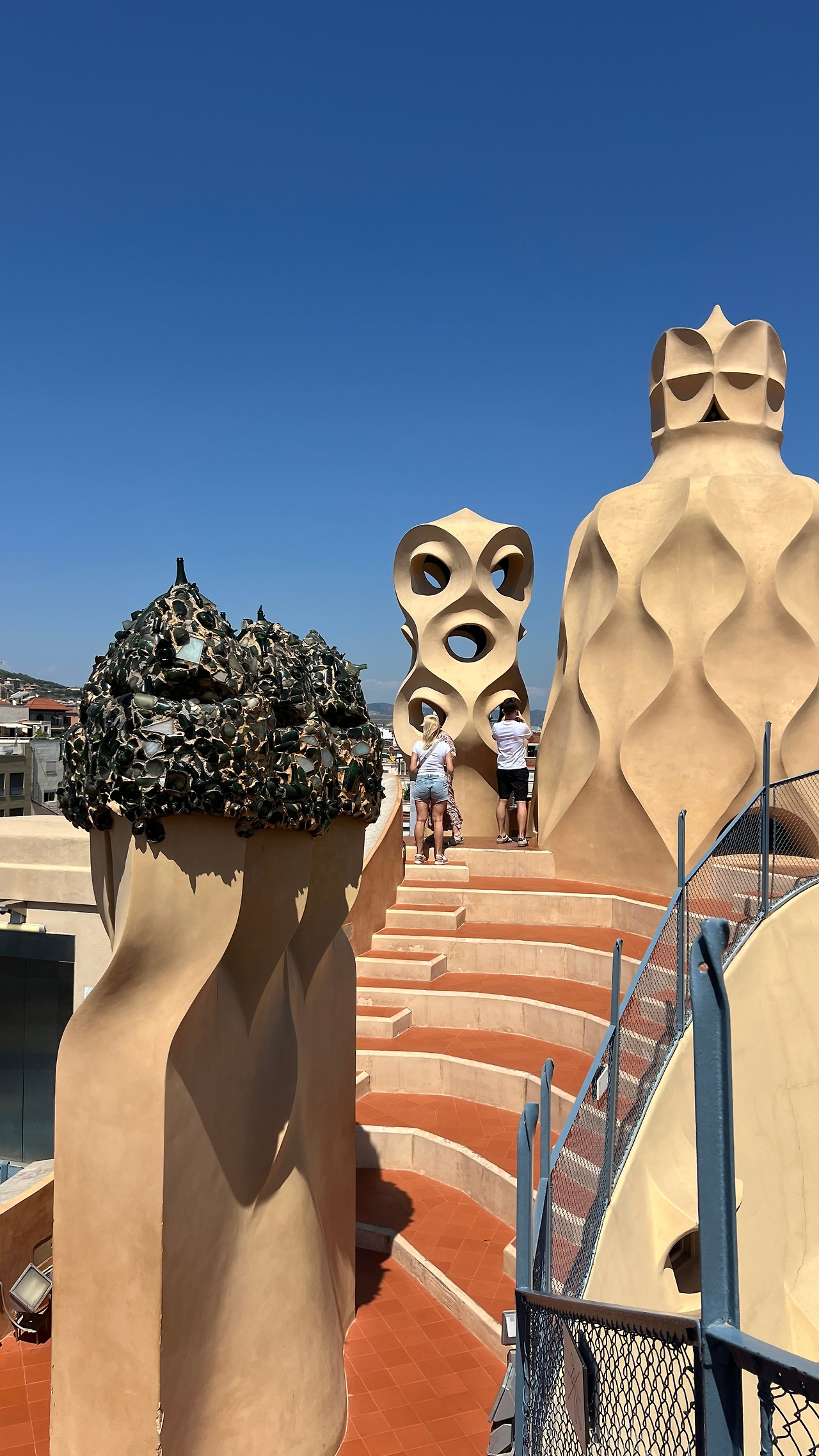 그리고 옥상에 올라서자 눈앞에 바르셀로나의 전경이 펼쳐졌다. 파도처럼 굽이진 지붕 위에는 기하학적인 형태의 굴뚝들이 줄지어 서 있었다. 조금 떨어진 곳에는 여전히 공사 중인 사그라다 파밀리아가 보였는데, 같은 하늘 아래 가우디의 두 작품이 서로 마주 보고 있다는 사실만으로도 묘한 감동이 밀려왔다.