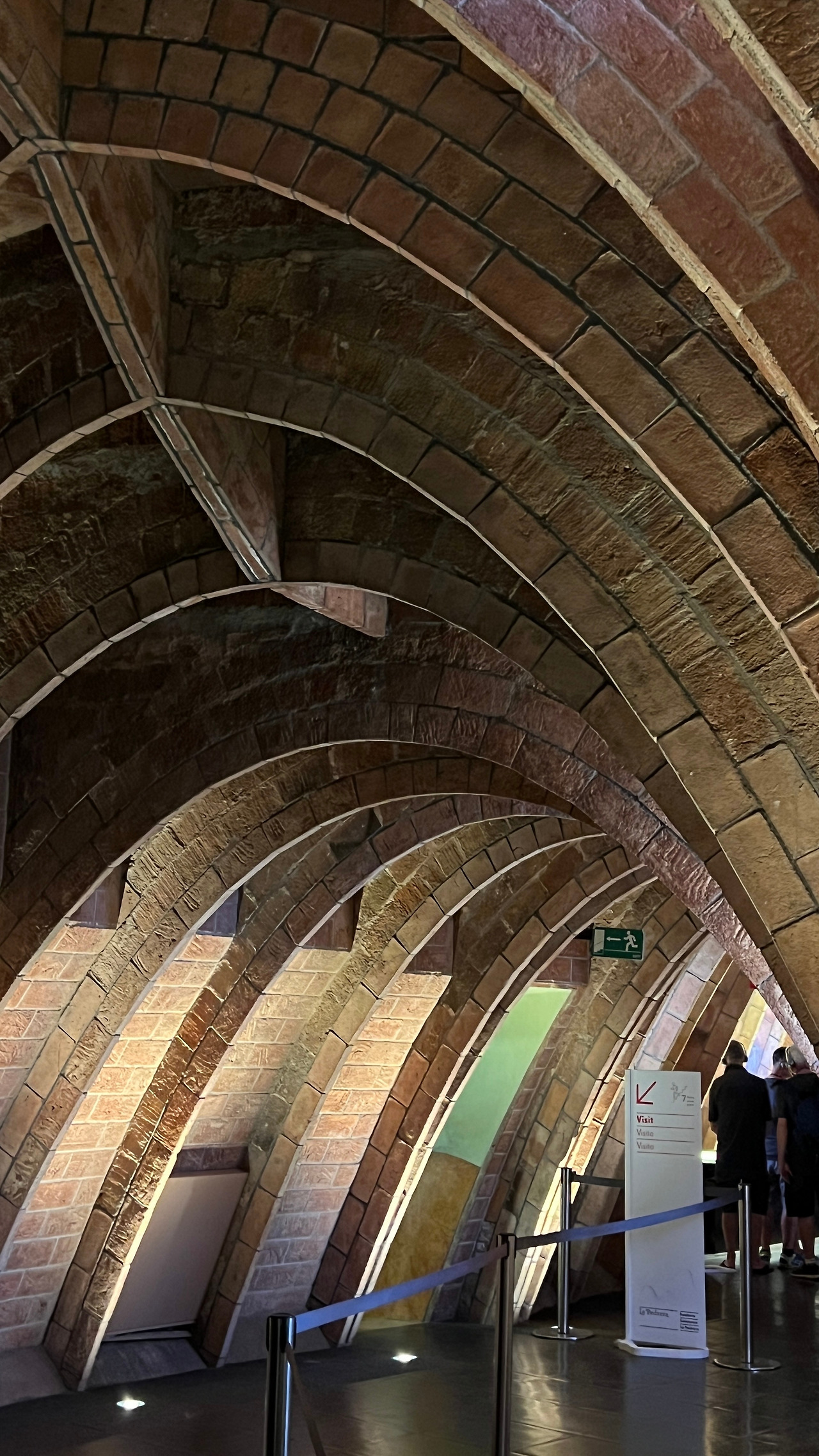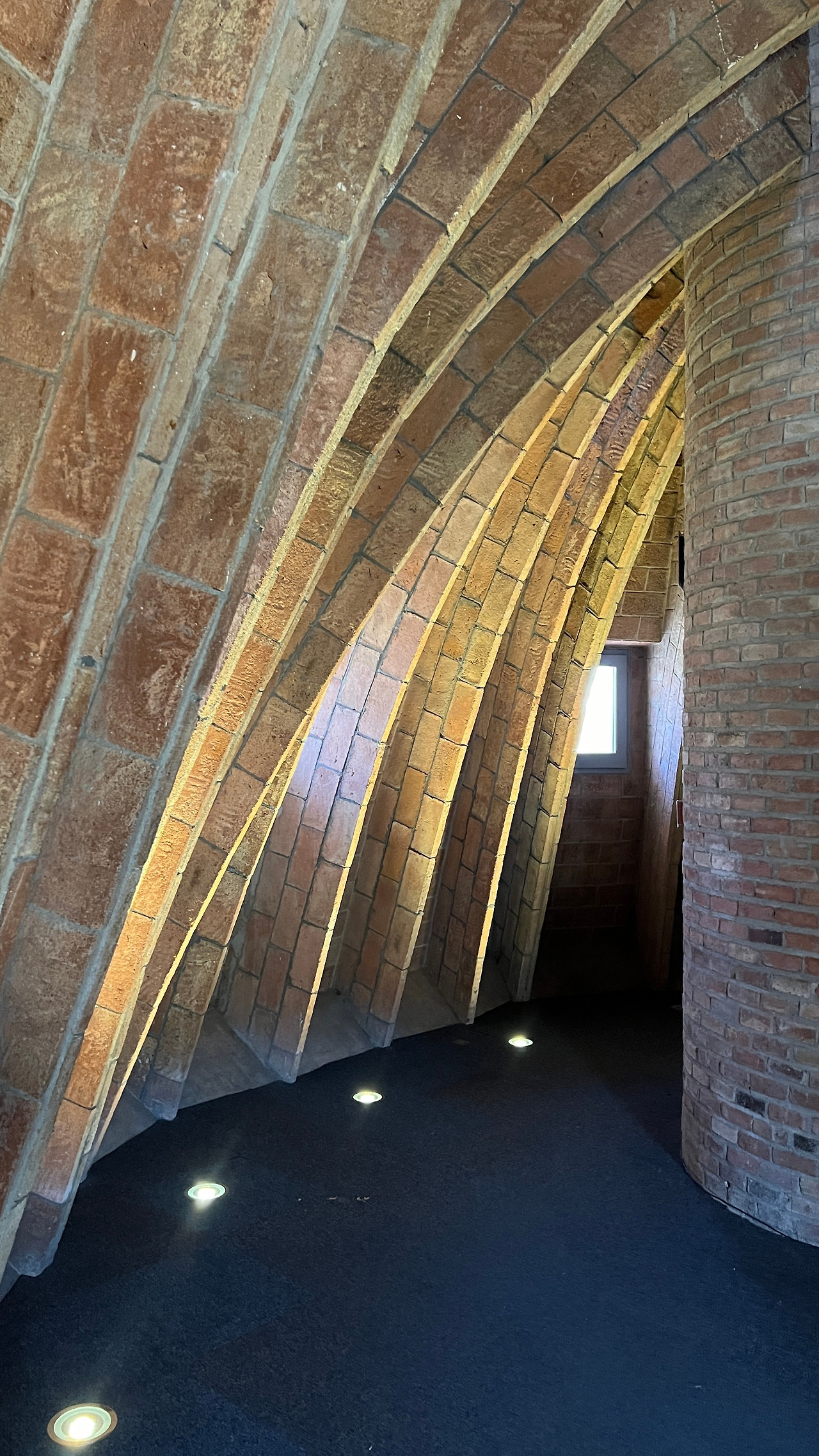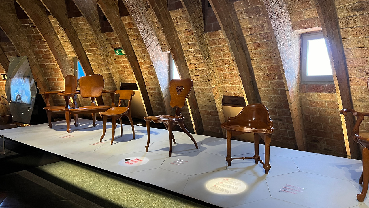 엘리베이터를 타고 꼭대기층에 올라서자, 곡선으로 이어진 다락 공간이 펼쳐졌다. 마치 고래의 갈비뼈 같은 곡선 아치가 연속적으로 이어지며, 단순한 구조물이 아니라 살아있는 생명체 속을 걷는 듯한 기분을 준다. 이곳은 ‘가우디 전시 공간(Espai Gaudí)’으로 꾸며져, 그의 건축 모형과 가구, 도면이 전시되어 있었다.