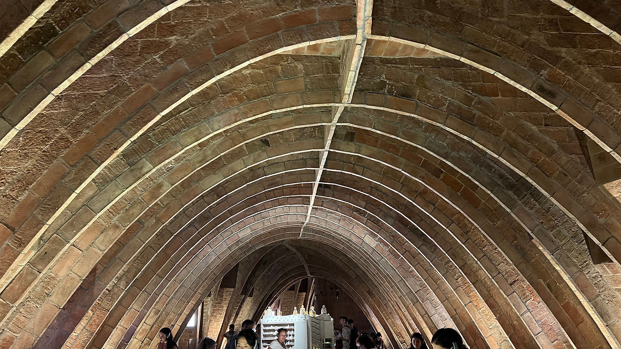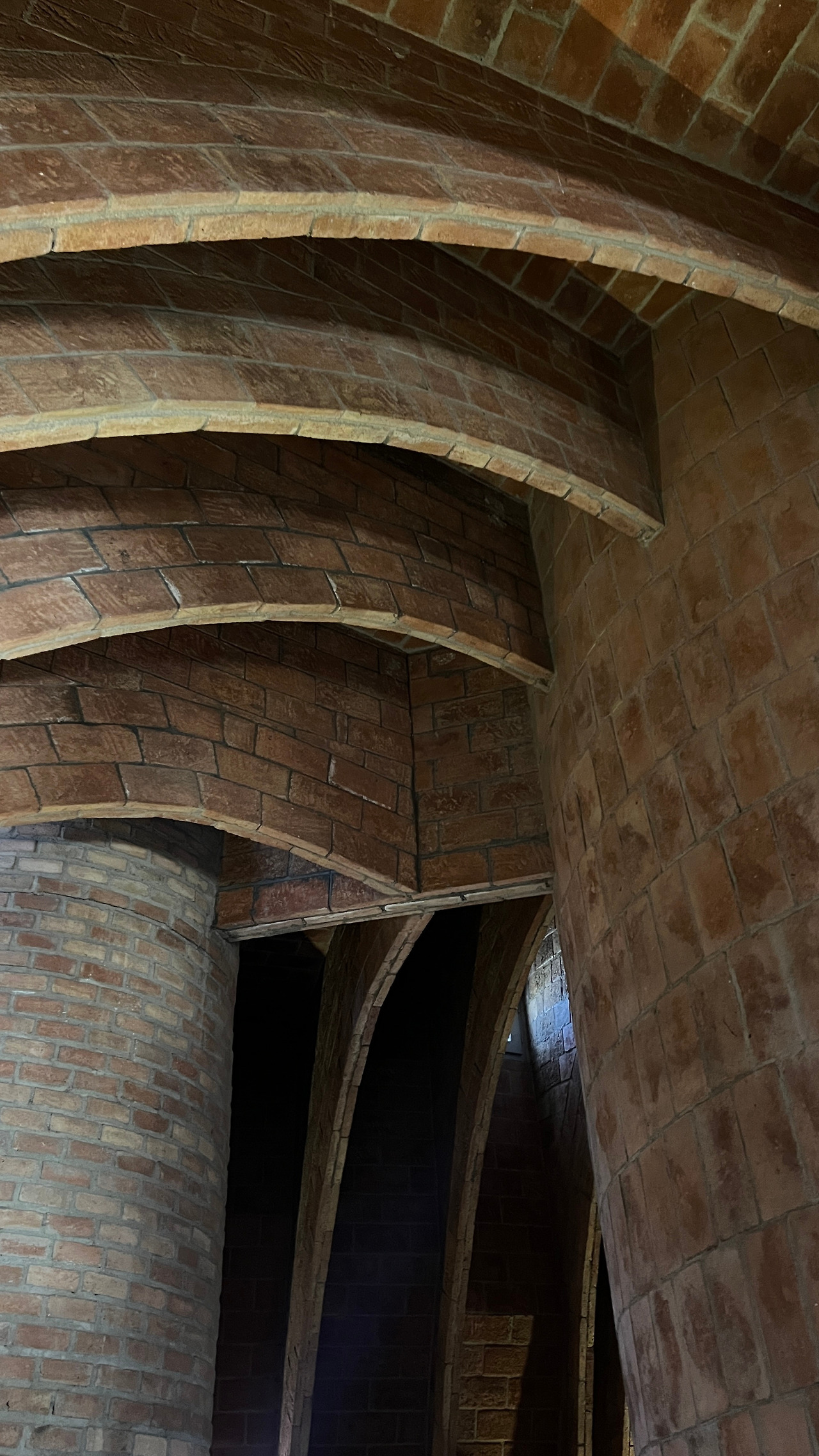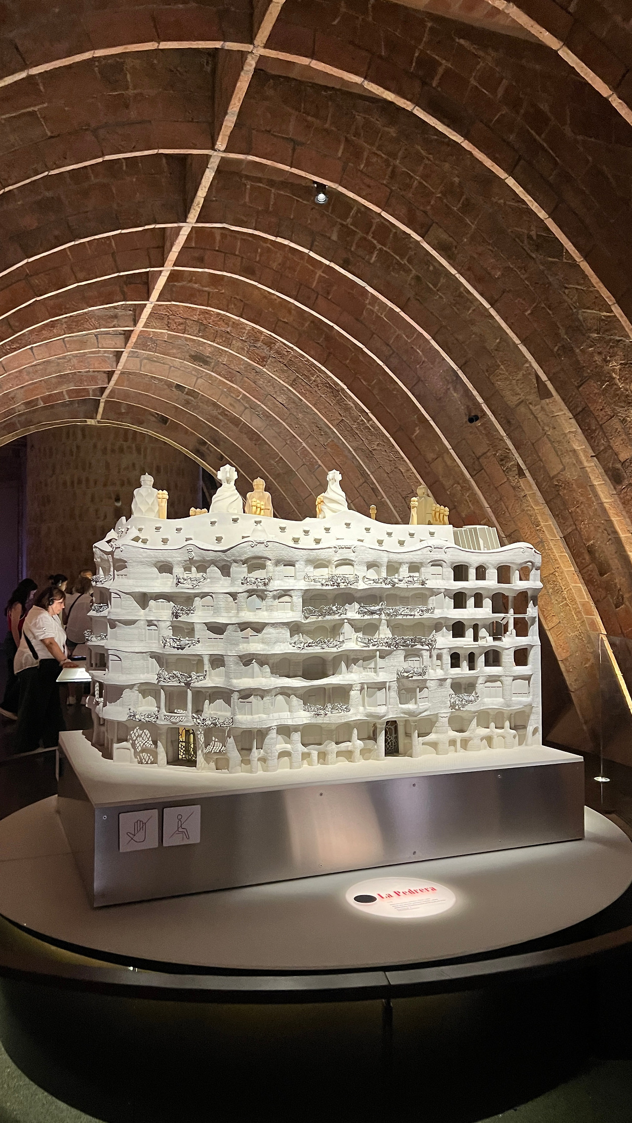 엘리베이터를 타고 꼭대기층에 올라서자, 곡선으로 이어진 다락 공간이 펼쳐졌다. 마치 고래의 갈비뼈 같은 곡선 아치가 연속적으로 이어지며, 단순한 구조물이 아니라 살아있는 생명체 속을 걷는 듯한 기분을 준다. 이곳은 ‘가우디 전시 공간(Espai Gaudí)’으로 꾸며져, 그의 건축 모형과 가구, 도면이 전시되어 있었다.