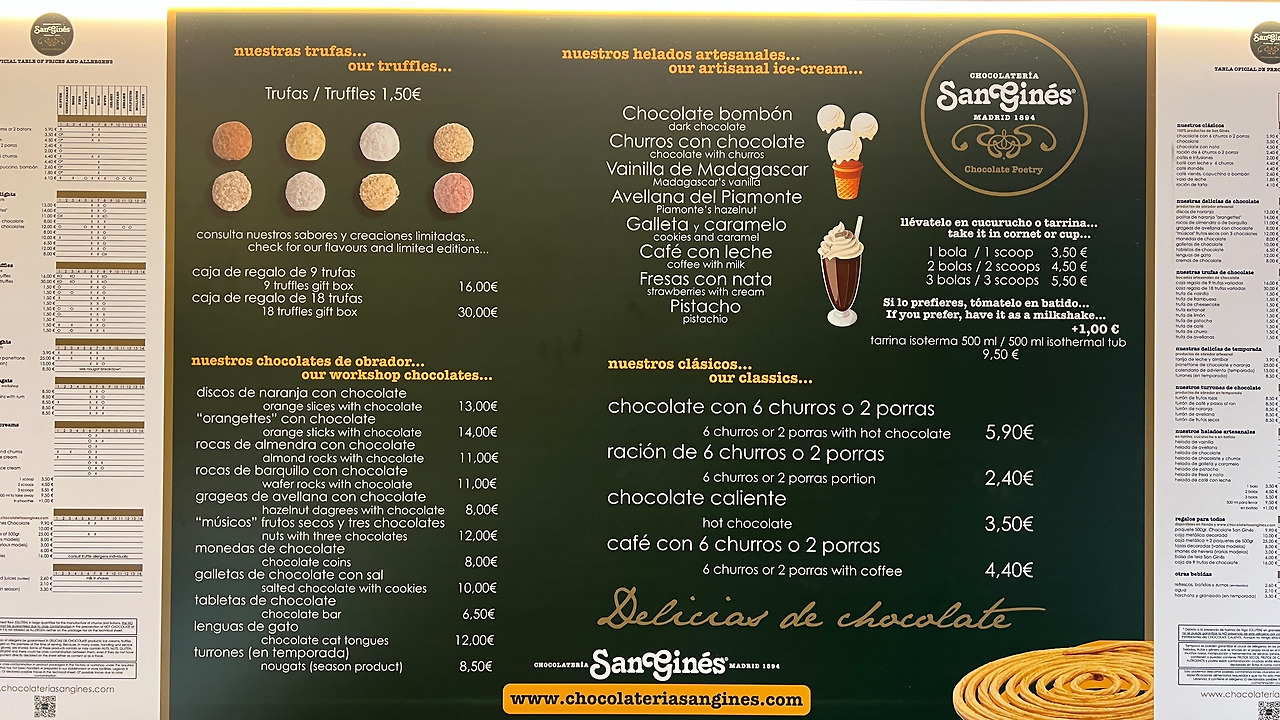 점심을 먹고 산 히네스(Chocolatería San Ginés)라는 디저트 가게로 향했다. 추로스 콘 초콜라테(Churros con Chocolate)라는 메뉴를 먹기 위해서 갔는데 초콜릿에 추로스를 찍어먹는 디저트이다. 원조라고 하긴 논란의 여지가 많지만 마드리를 대표하는 문화 중 하나가 바로 핫 초콜릿에 추로스를 찍어먹는 것이라고 한다.