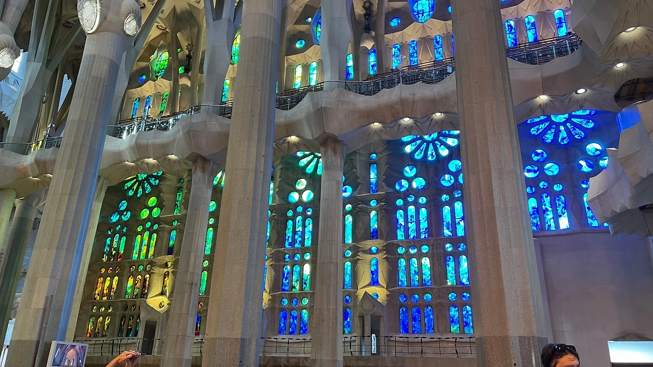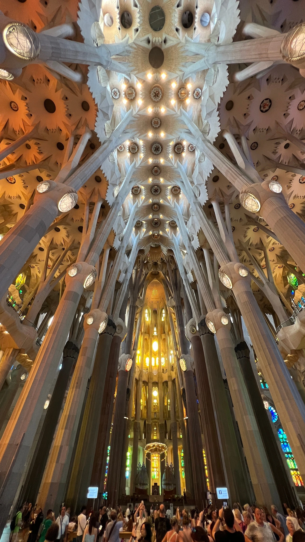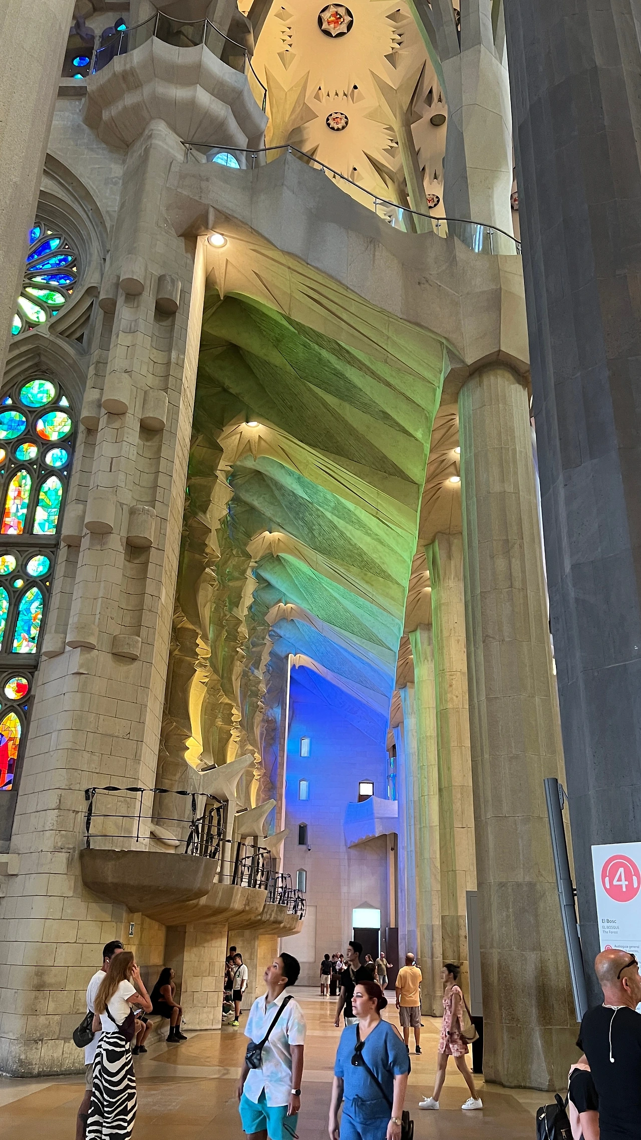 외부 파사드의 조각들에 대한 설명을 듣고 나서 내부로 들어가면 그 황홀함에 모두 천장을 바라보게 된다. 숲처럼 뻗은 기둥, 스테인드글라스 창을 통한 빛의 연출이 구현되어 사람들에게 큰 감동을 준다. 예전과 비교했을 때 첨탑들이 완성되면서 내부에서도 더 다양한 빛이 들어오고, 높이감이 극적으로 강화된 모습이었다.