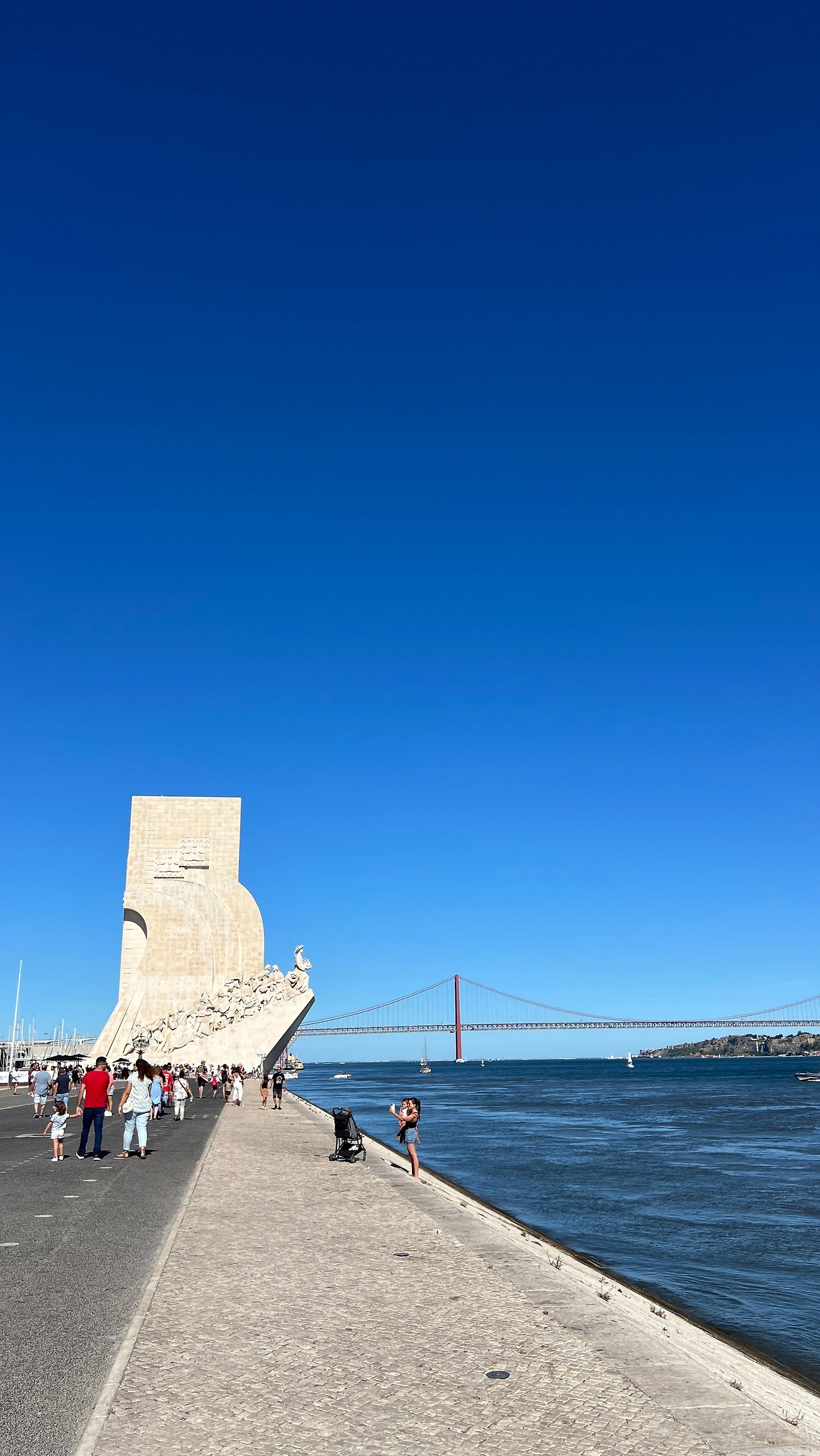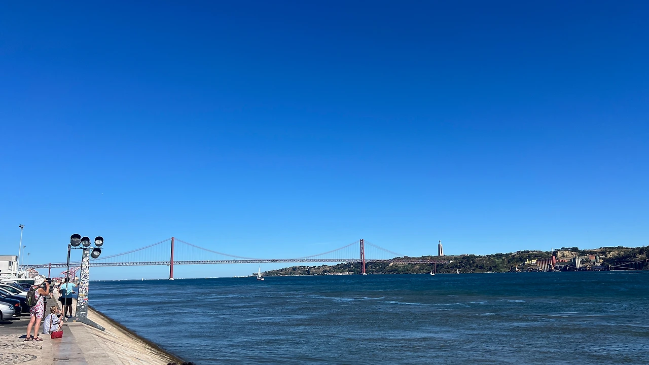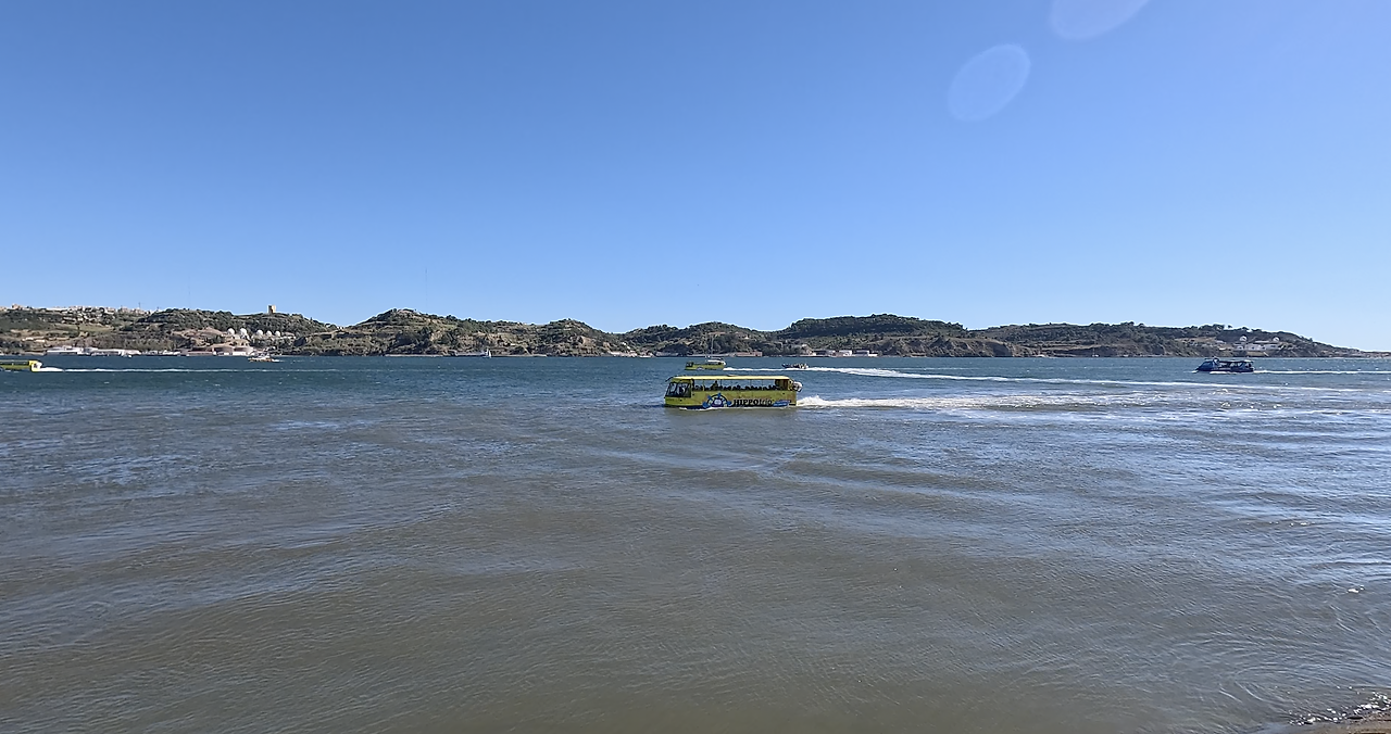 기념비 앞으로는 해양선박들도 지나다닐 만큼 큰 규모의 타구스강(Tagus River)이 시원하게 펼쳐진다. 저 멀리 4월 25일 다리도 보이고 대형 기념탑이 마치 항구도시의 앞바다 같은 모습이다. 지구오락실에서 단체로 자전거를 타며 게임을 했던 그곳이다. 수륙양용 버스 히포도 이곳을 지나다닌다.