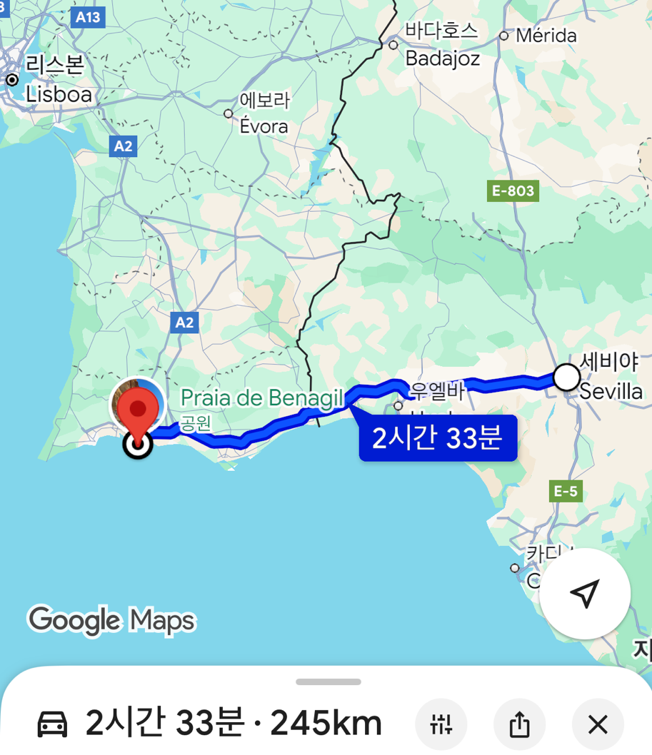 세비야에서 리스본까지 한 번에 이동하기에는 너무 멀어서 중간 경유지를 찾다가 베나질 동굴의 사진을 보게 되었다. 대서양과 맞닿아 있는 포르투갈 남부의 유명한 관광지이다. 도저히 그냥 지나칠 수 없었다.