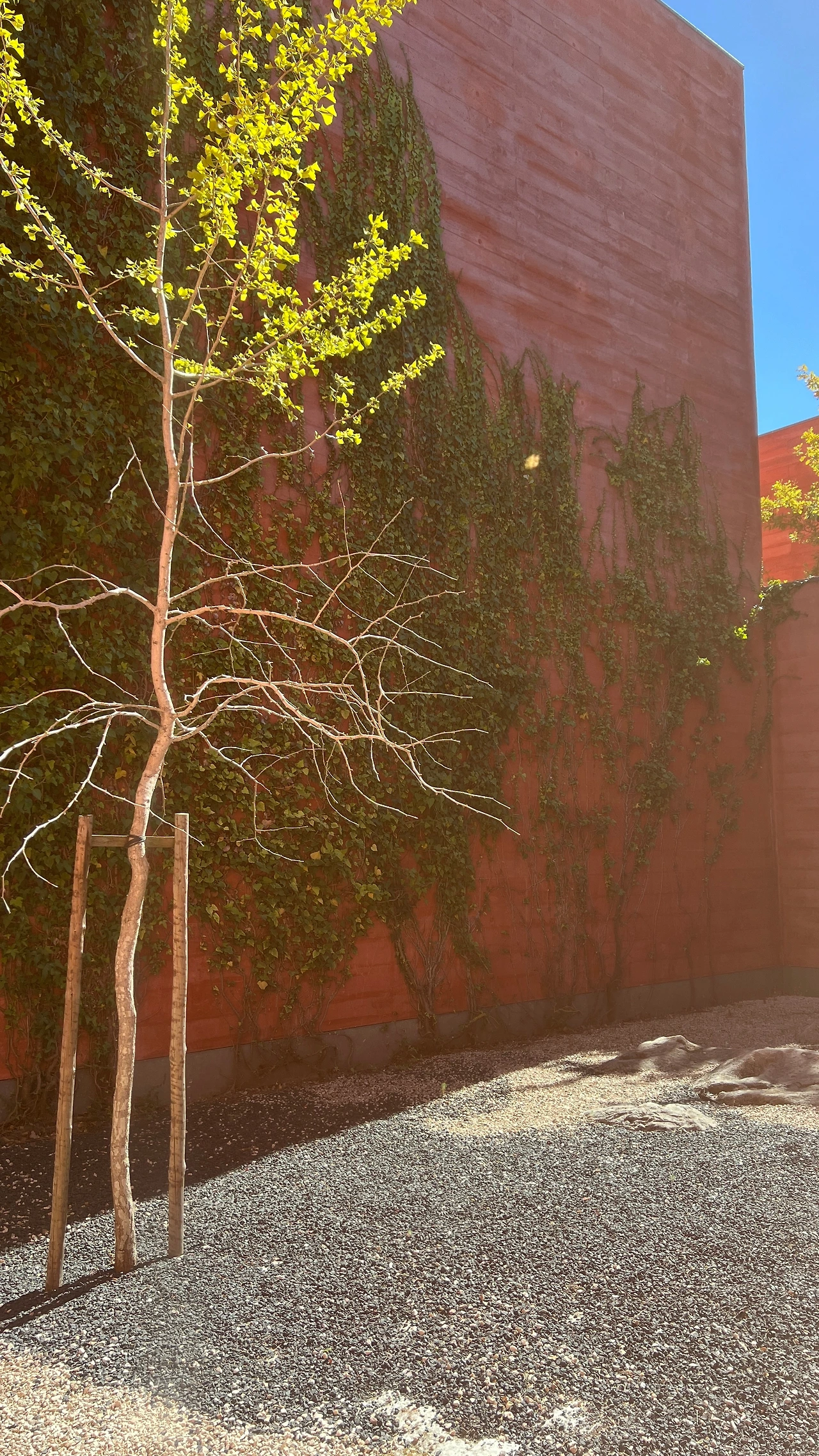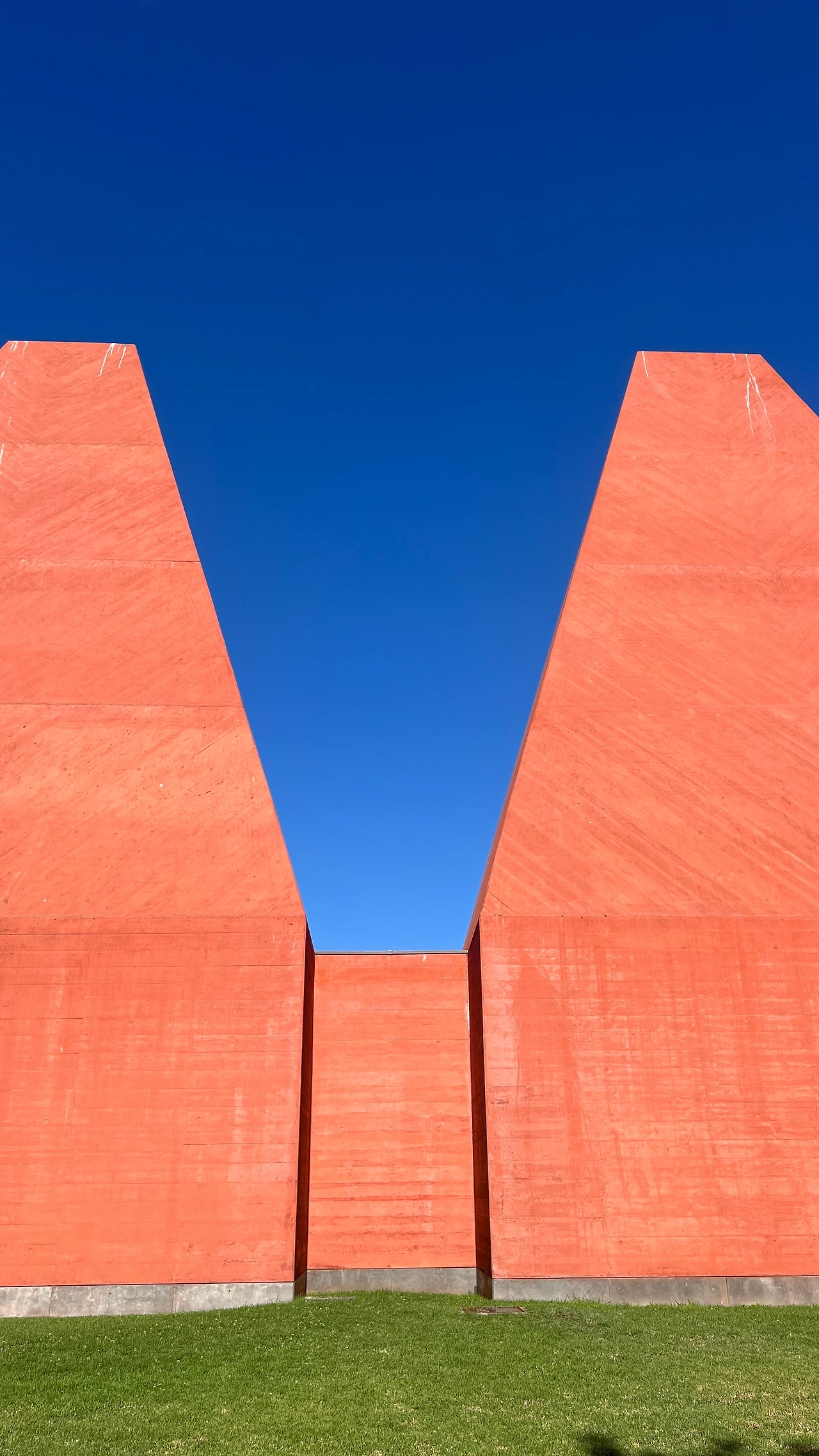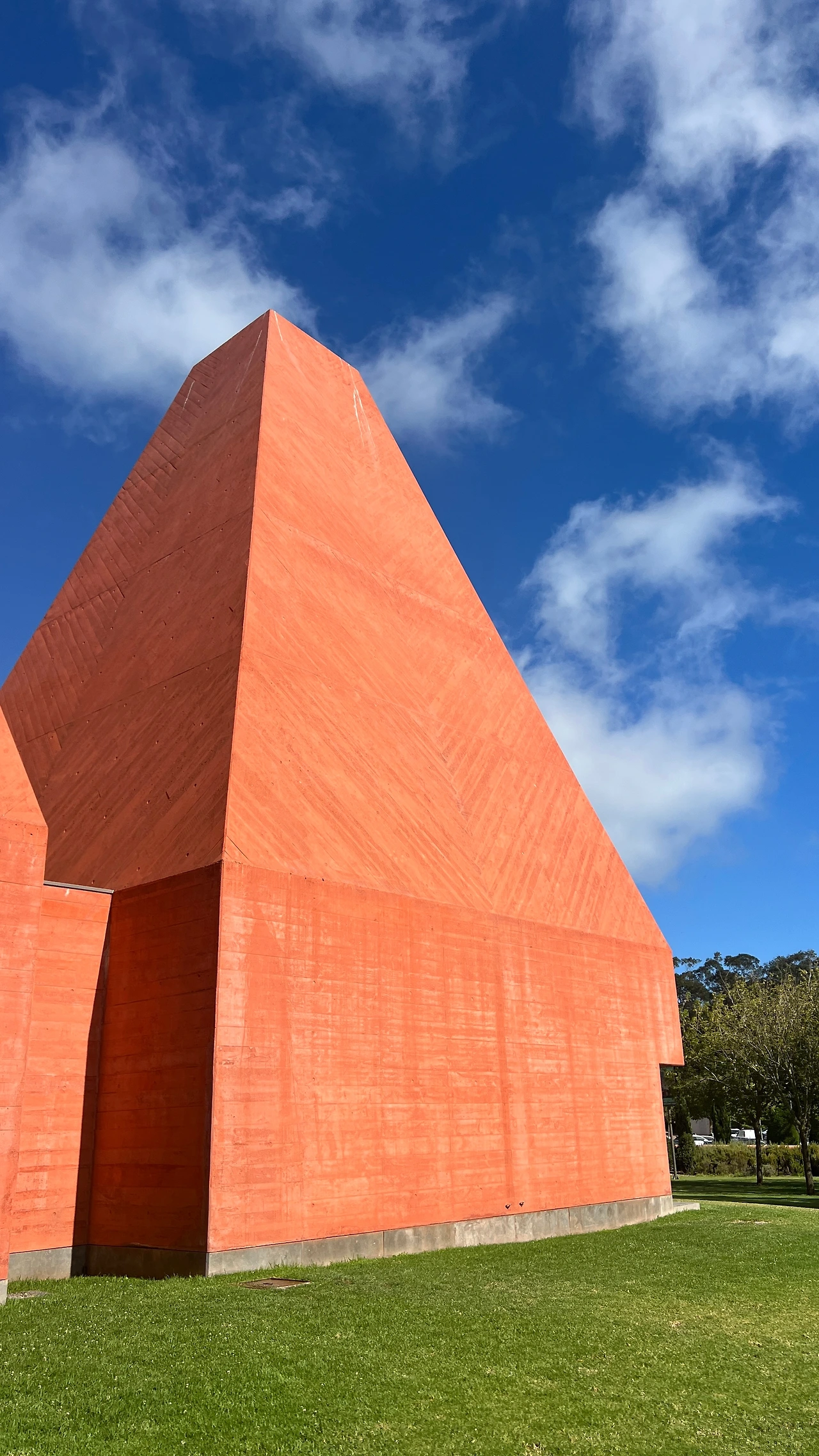 건물 외관 자체가 멀리서 봐도 강한 인상을 주고 있었다. 두 개의 피라미드형 탑이 위로 솟아 있고, 붉은색 콘크리트 매스가 숲의 녹색, 하늘의 푸른 하늘과 대비되어 일반적인 미술관의 모습을 상상할 수가 없었다.