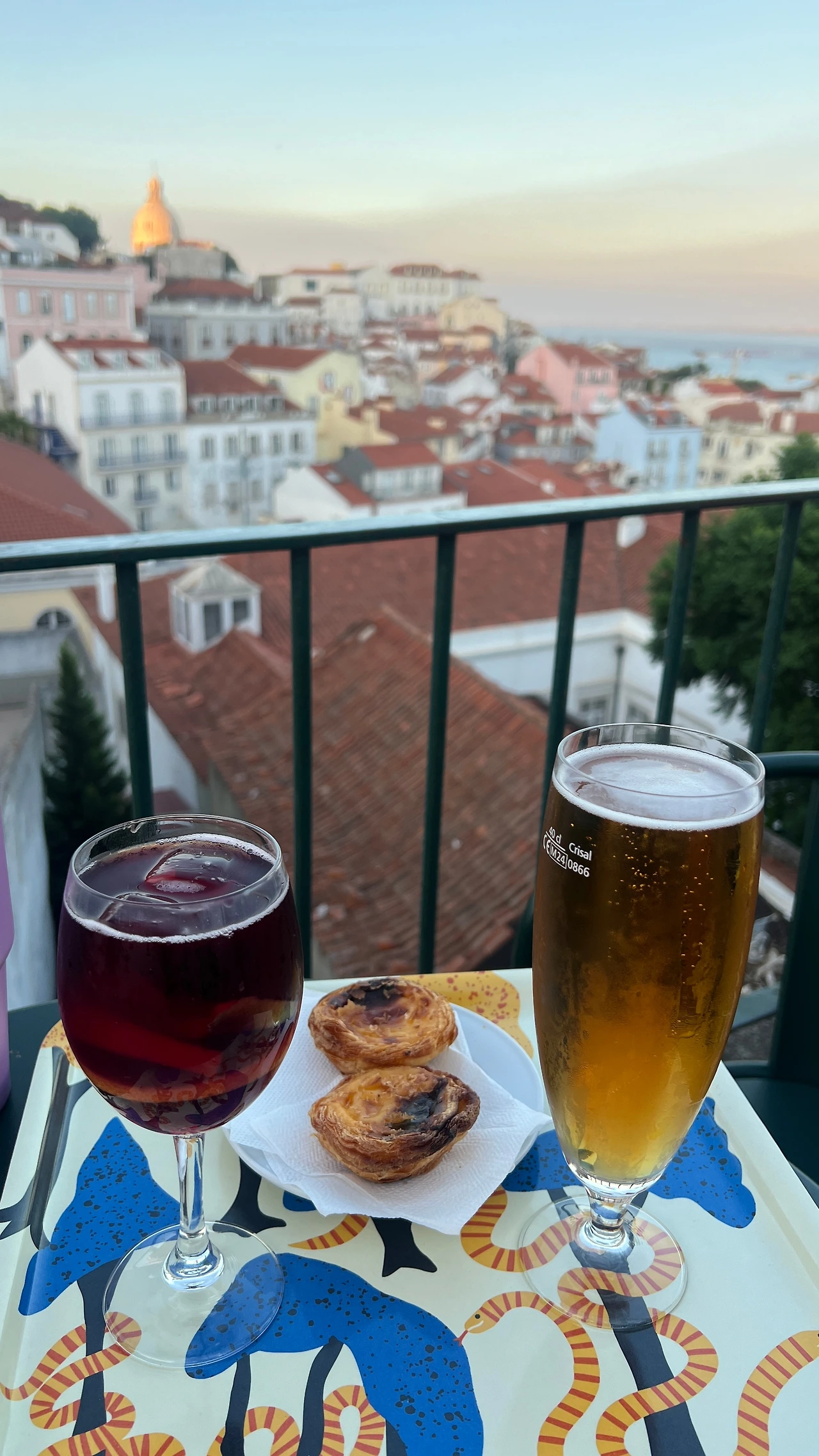 유럽에서도 손꼽히는 노을을 보기 위해 노상카페의 자리를 찾는데 자리가 쉽게 나지 않는다. 한참을 기다려서 겨우 자리를 잡고 맥주와 에그타르트를 시켜놓고 해가 지기를 기다렸다.
