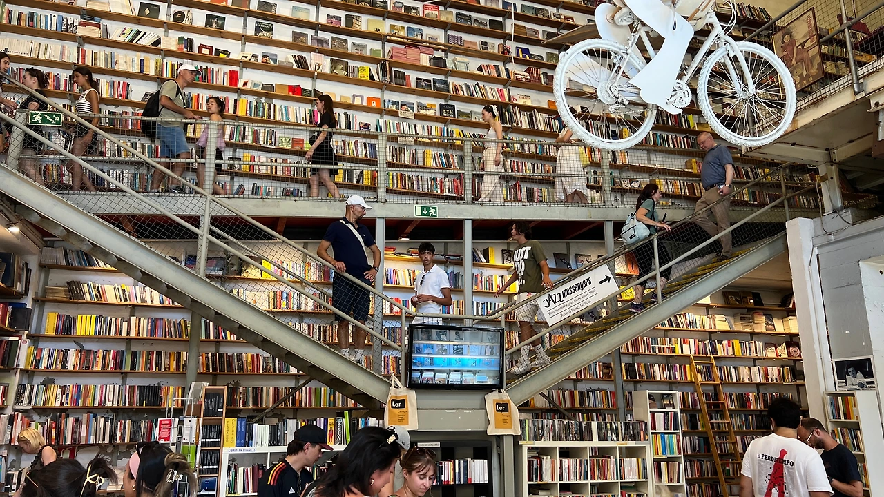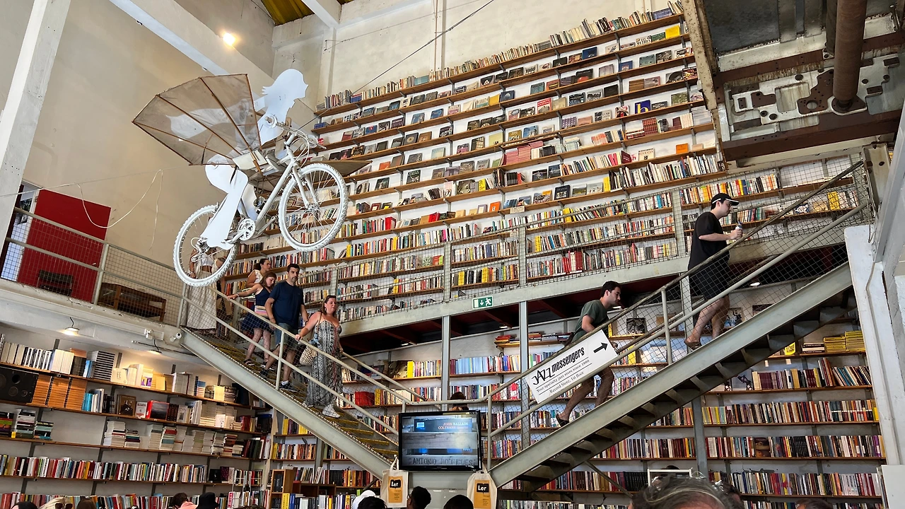 인더스트리얼한 공간 안에 거대한 책장과 자전거를 타고 날고 있는 사람 형상을 한 예술 설치물로 유명한 Ler Devagar 서점도 사진 찍기 좋은 스팟이다. 원래 인쇄공장이었던 곳이라 천장이 높고 남아있는 철제 구조물들을 볼 수 있어 독특한 분위기가 매력적이었다.