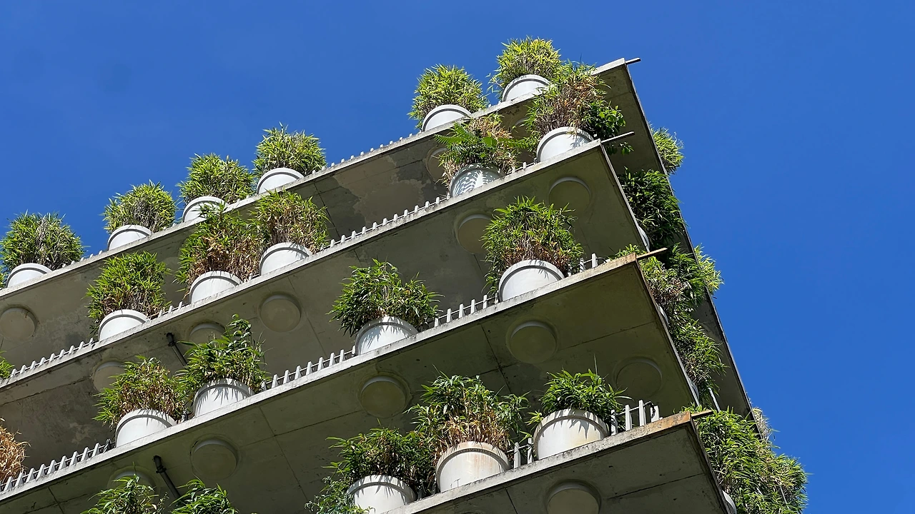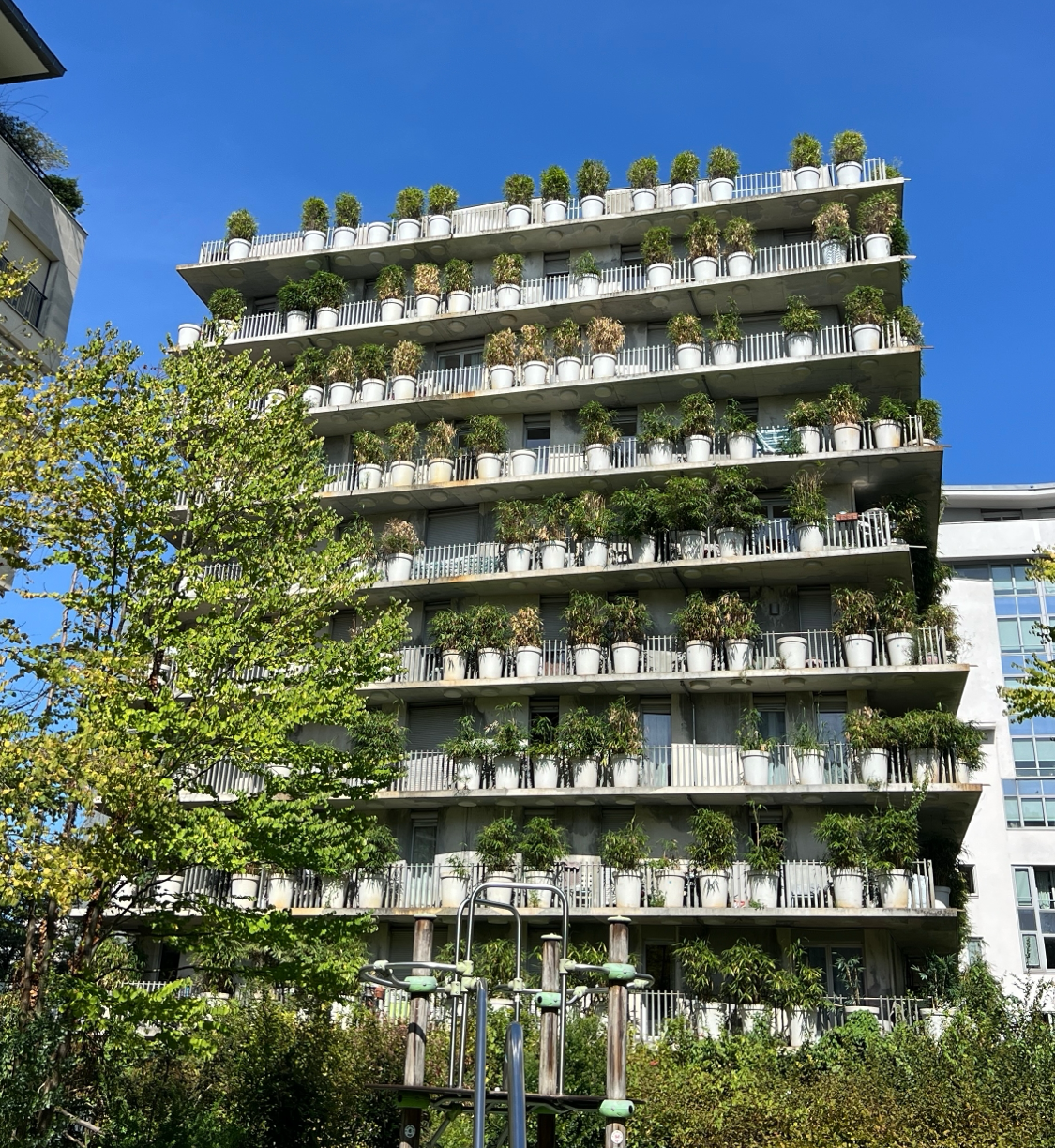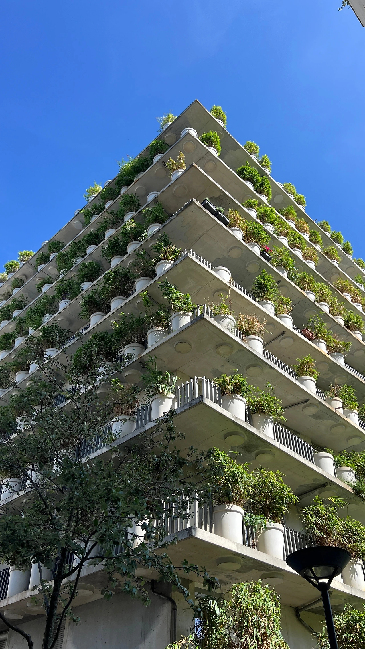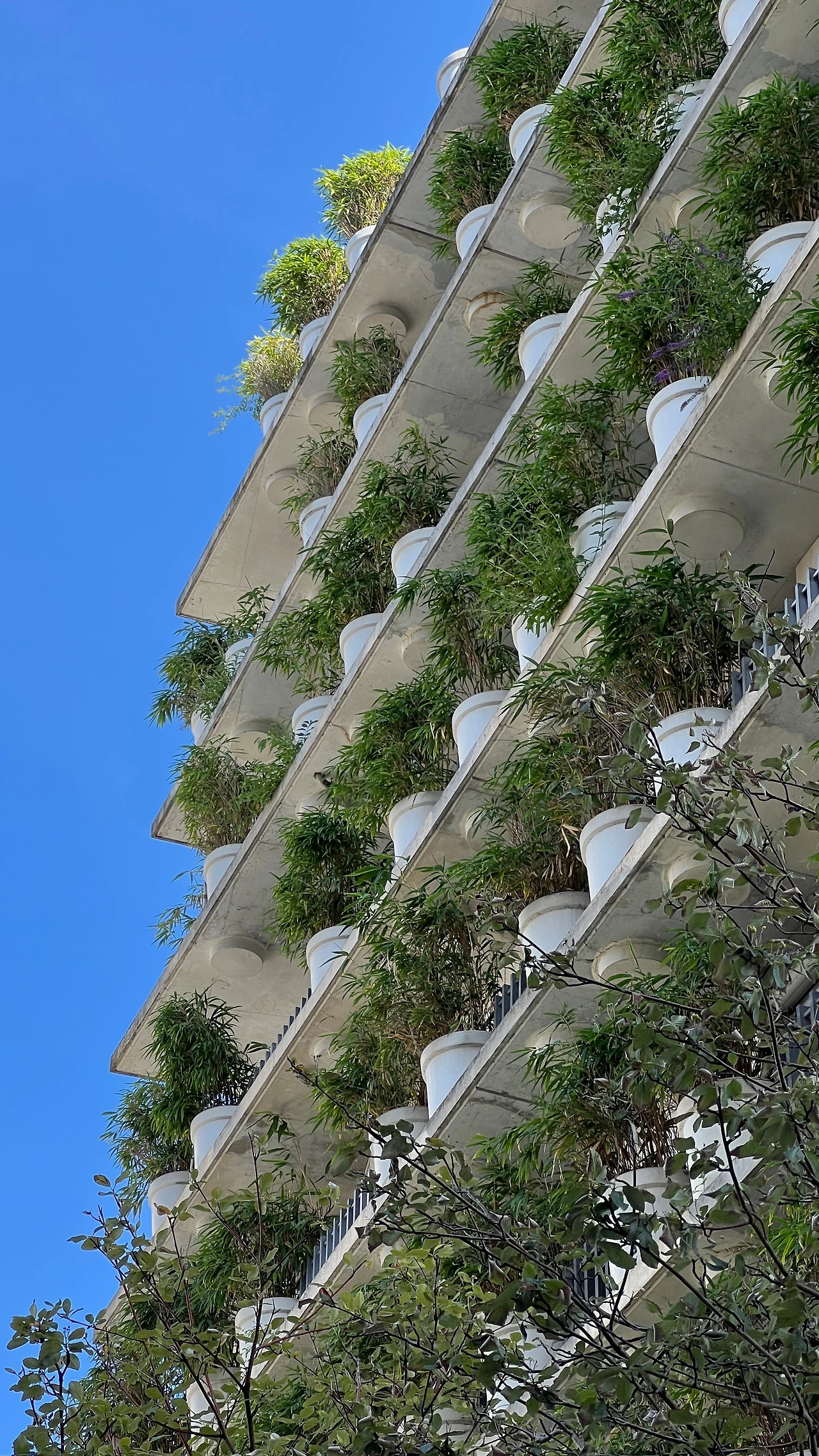 각 층 발코니를 따라 동일한 형태의 화분이 촘촘하게 배치돼 있고, 식재가 만들어내는 깊이감 덕분에 전체 매스가 단조롭지 않게 보였다. 화면으로만 보던 단순한 반복 패턴이 현장에서는 주변 수목과 섞이면서 더 자연스럽게 읽혔고, 실제 주거 건축에서 녹지 요소를 어떻게 입면으로 끌어오는지 직접 확인할 수 있었다.