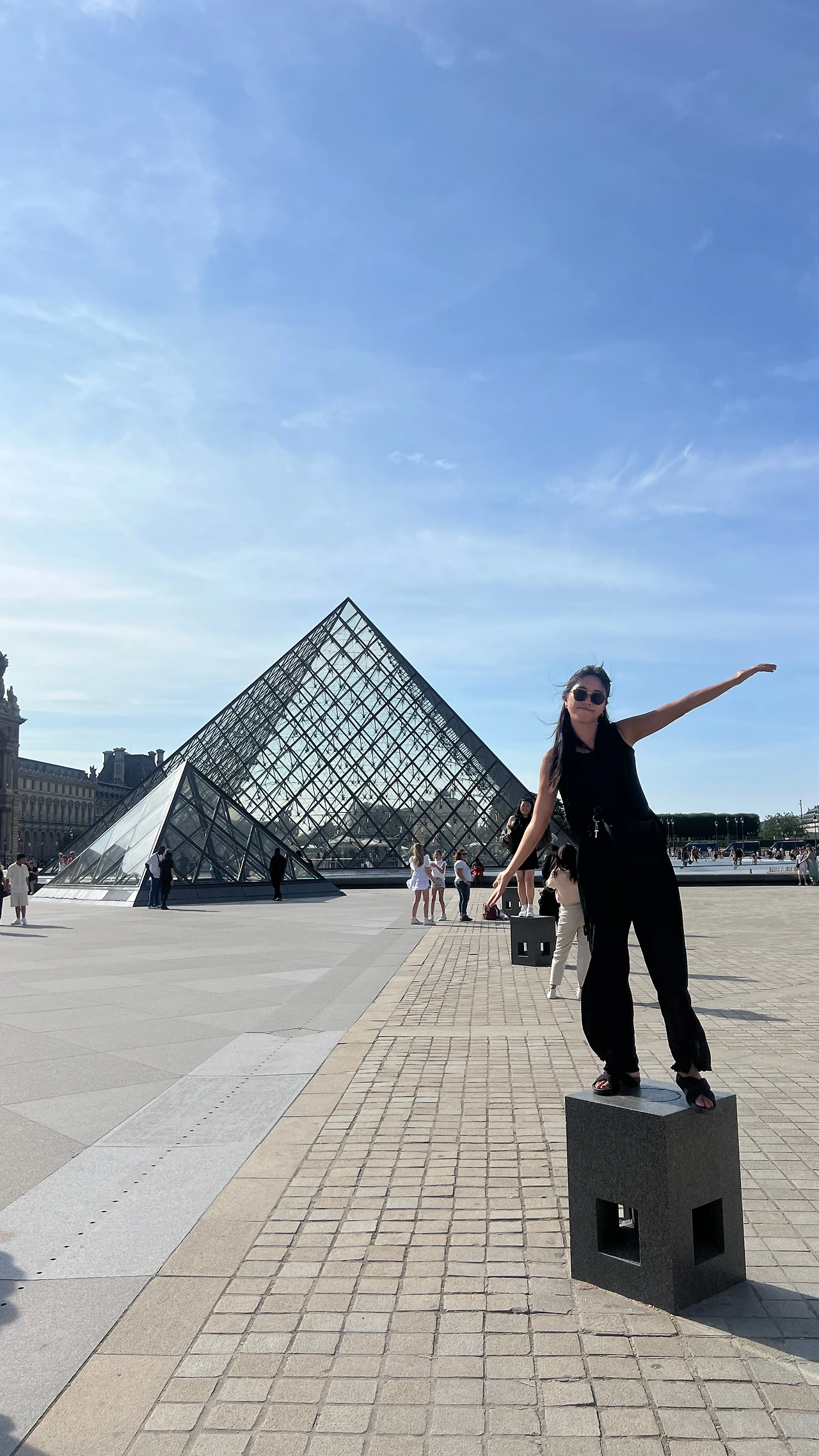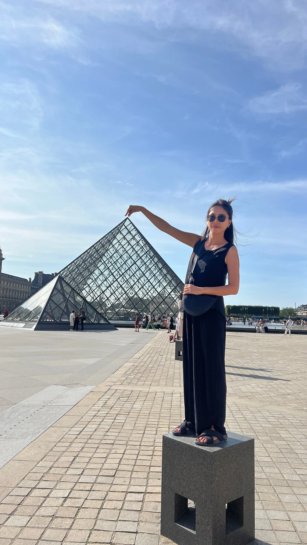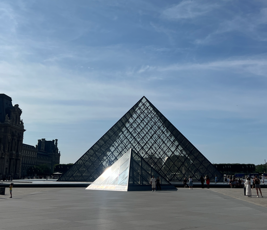 1190년경 중세 시대에 방어 요새로 쓰이던 공간부터 여러 왕들의 취향이 반영된 공간들이 쌓이며 왕궁으로 쓰였고, 현재의 루브르가 되었다고 한다. 고전적 석조 건물과 대비되는 현대적 건축재료인 투명 유리구조로 되어있고 아래에는 대규모 지하 로비(Carrousel du Louvre)가 연결되어 있다. 대비되는 건물이 프랑스의 역사를 잘 보여주고 있는 거 같았다.