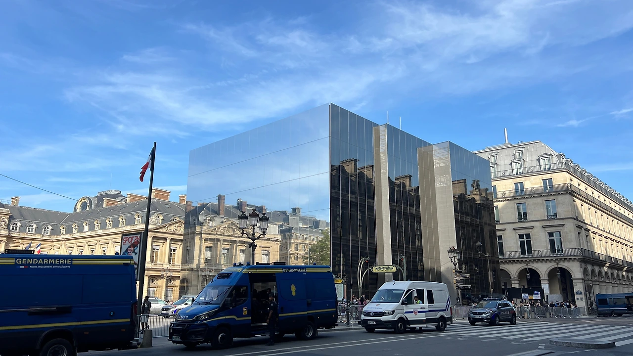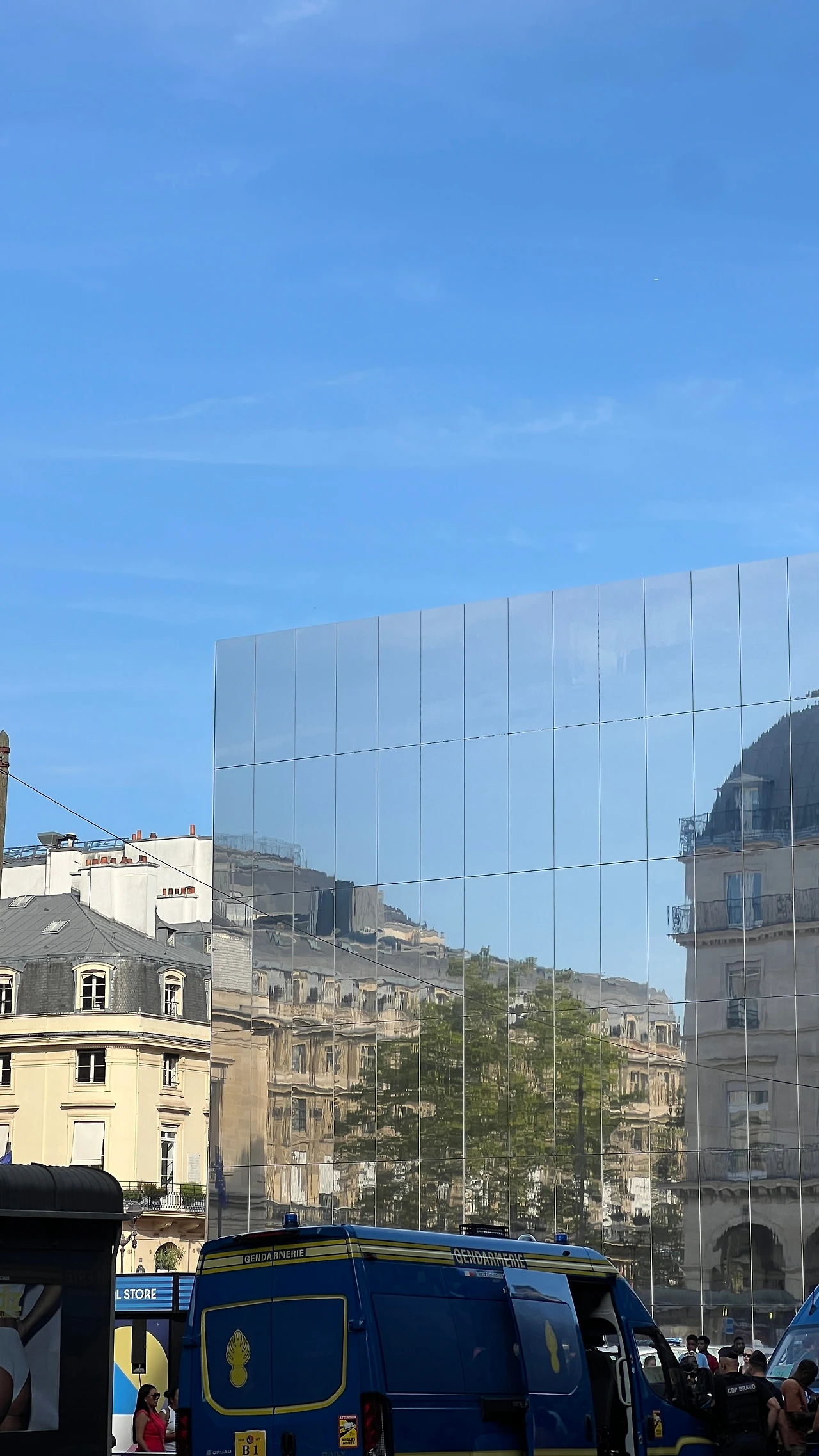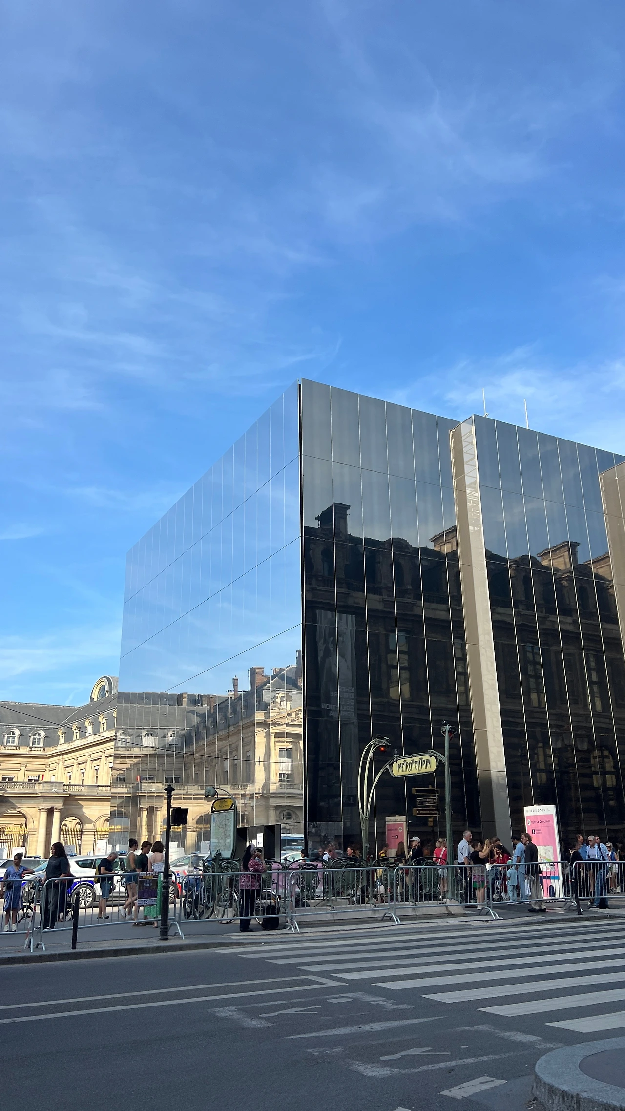 루브르 박물관 광장에서 빠져나오자마자 발 결한 아래 건물은 반사율을 극대화해서 하늘과의 경계선이 없는듯한 착각을 불러일으켰다. 각도에 따라 반사되는 건물이 절묘하게 비춰서 투명하게 보인다.