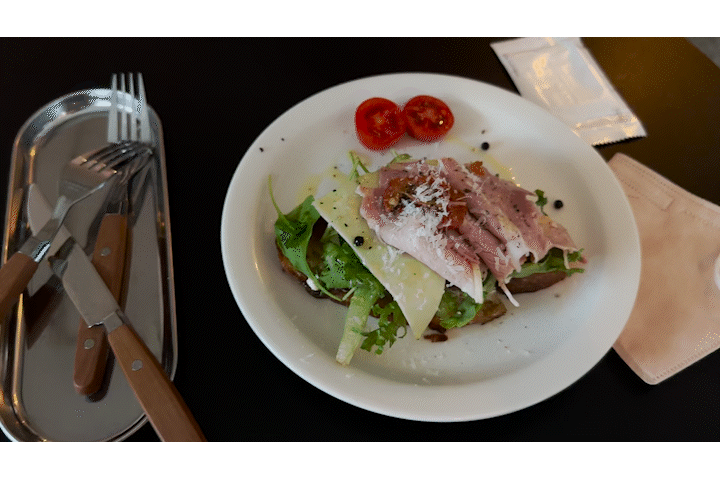 나는 아마도 '오픈 잠봉뵈르 샌드위치' 그리고 '오렌지 커피'를 시키고, 친구는 '초코칩 쿠키' 그리고 레몬이 들어간 차였을까..? 뭔가 쿠키랑 레몬이 떠있는 커피가 아닌 음료를 시켰던 것은 기억이 나는데 정확히 이름이 기억이 나질 않는다