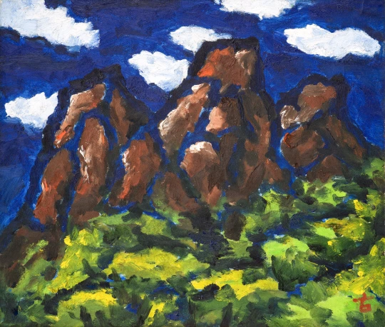 '도봉산', 캔버스에 유채, 1980년대 우리나라 서양화가 중에서 박고석(1917~2002)만큼 산을 소재로 지속적으로 그림을 그렸던 화가도 드물 것이다. 물론 산이 많은 우리나라의 지형적 특성으로 해서 산은 수많은 화가들의 소재가 되어 왔고, 김원과 같이 눈 쌓인 산 그림을 그려 왔던 이가 없었던 것은 아니지만 박고석처럼 우리의 산에 대해 깊이 천착했던 화가의 예를 찾기 힘든 것이 사실이다.
