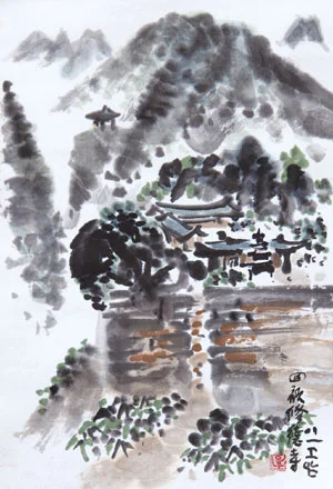 고암이 1980년에 그린 '수덕사'라는 그림도 산수라는 전통적인 소재의 그림이지만 청전과 소정의 그림에 비해 단순화된 화면이 얼마나 현대적인 감각이 넘치는 그림인지를 수긍하게 된다. 수분이 많은 발묵으로 먹의 번지는 효과를 잘 살린 이 그림에서 반추상을 거쳐 추상으로 나아가고자 하는 고암의 의도가 보이기도 한다.