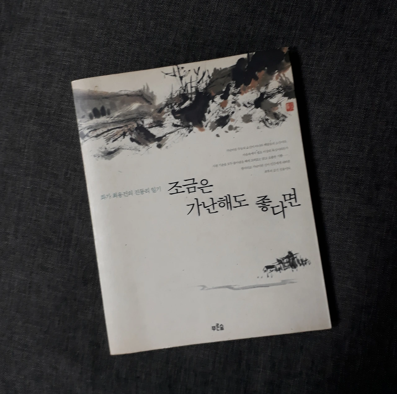 시중에 나왔던 많은 산문집 중에서도 오래 잊지 않고 꺼내 읽게 되는 것으로 '조금만 가난해도 좋다면'이라는 제목의 책이 있다. 2001년에 나왔던 책으로 '화가 최용건의 진동리 일기'라는 부제가 나타내듯 최용건이라는 화가가 강원도 인제의 진동계곡을 터전으로 자연과 함께 살아가며 느끼는 감동을 기록한 산문집이다. 그렇다고 한 화가의 속 편한 전원생활이 소재가 된 책은 아니다. 서울에서 고등학교에서 미술을 가르치다 그만두고 사람의 발길이 뜸한 오지를 택해 정착한 곳이 진동계곡이었다. 작가는 그곳에서 자신의 호인 천전(天田)을 따라 이름 붙인 '하늘밭 화실'에서 그림 그리고 농사짓고 민박을 치면서 살아가고 있다. 작가 부부가 딱 생활할만큼만 농사를 짓고 있으니 자발적인 가난을 선택한 경우라고 하겠다. 그렇게 자연 속에서 생활하면서 자연에서 작가가 느끼는 축복 같은 감동이 아름답게 전해 오는 책이다.