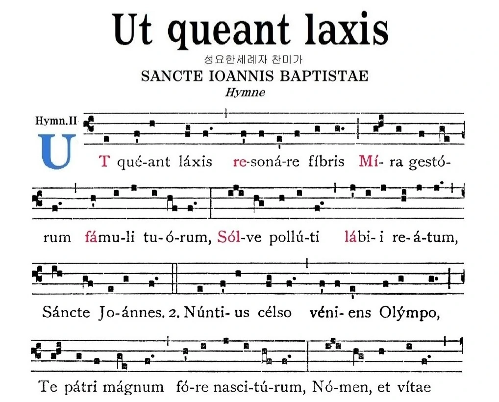 또한 잘 알려진 노래인 성 요한 세례자 축일 찬미가인 'Ut queant laxis'에서 ut, re, mi, fa, sol, la 등 헥사코드, 즉 6음 음계의 이름을 정했다. 이는 17세기에 이르러 si가 추가되어 오늘날의 7음 음계를 완성하고, 발음 상의 이유로 ut는 do로 명칭이 바뀌게 된다.