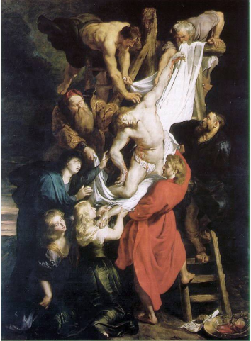 위의 루벤스가 그린 '십자가에서 내려지는 그리스도'를 자세히 살펴보면 화면을 구성하는 중심 되는 예수에 가장 강한 빛이 머물고 그 외 인물 군상을 벗어난 부분은 어둡게 처리, 명암의 대비로 주제를 강조하는 효과를 가져오고 있습니다. 그리고 이처럼 수직적인 구도는 드라마틱한 화면 구성이 가능케 하는 것으로 르네상스 미술의 수평적인 구도가 주는 온화함에 비하면 확연히 구별되는 바로크 미술의 특징이라고 할 수 있습니다.