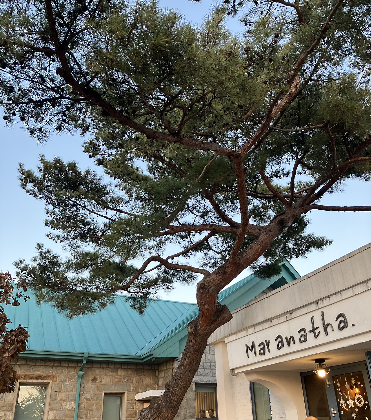 음악회가 끝나고 교인들의 인사도 많이 받았다. 홀가분하고 기쁜 마음으로 예배당을 나오니 서서히 땅거미가 내려앉고, 철새는 무리를 지어 보금자리를 찾아들고 있었다. 교회에 폐를 끼치기 싫어 사전에 사양을 했었는데도 교회에서 순무김치와 밴댕이 젓갈 등 강화 토속음식을 곁들인 저녁을 준비했다. 식사가 준비된 카페 마라나타 앞에는 교회와 역사를 같이 하는 소나무 한 그루가 보기에도 아름답다.