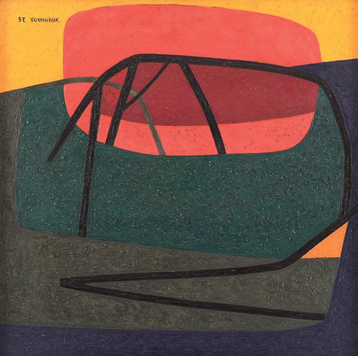 암녹색의 바탕색을 기조로 화면을 분할하는 선과 색면이 긴장감을 구성하는 이후의 작품 경향에 비해 두터운 마티에르의 원색이 주는 강열함이 두드러진 이 그림은 검은 선으로 표현된 산등선 너머로 넘어가는 태양과 노랗게 물들어가는 하늘의 모습을 짐작할 수 있다. 비록 초창기 작품이지만 그의 작품에서 느낄 수 있는 선과 색면에 의한 균형감과 긴장감을 여실히 느낄 수 있다. 그리고 우리는 그의 그림을 보면서 유영국의 마음에 그려진 우리 산하의 아름다움에 공감해 보는 것이다.
