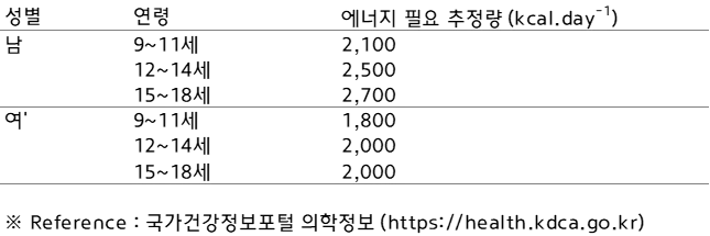 U12(12~14세) 기준 하루 2,500kcal, U15(15~18세) 기준 하루 2,700kcal 가 필요하다고 되어있습니다.