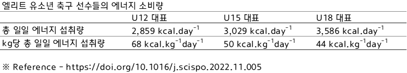 아래는 메타 논문에서 제시한 '엘리트 유소년 축구 선수들의 에너지 소비량'입니다.