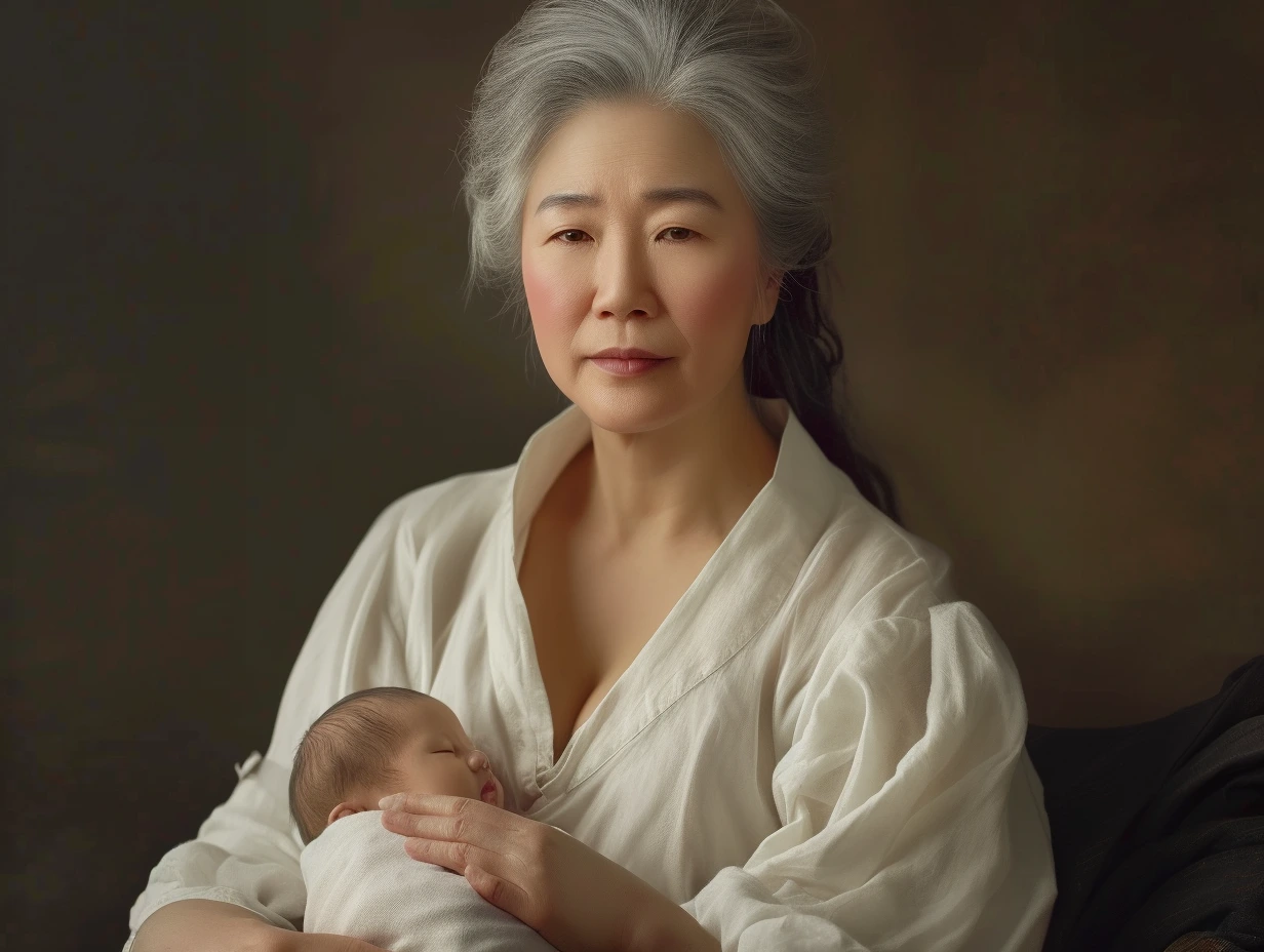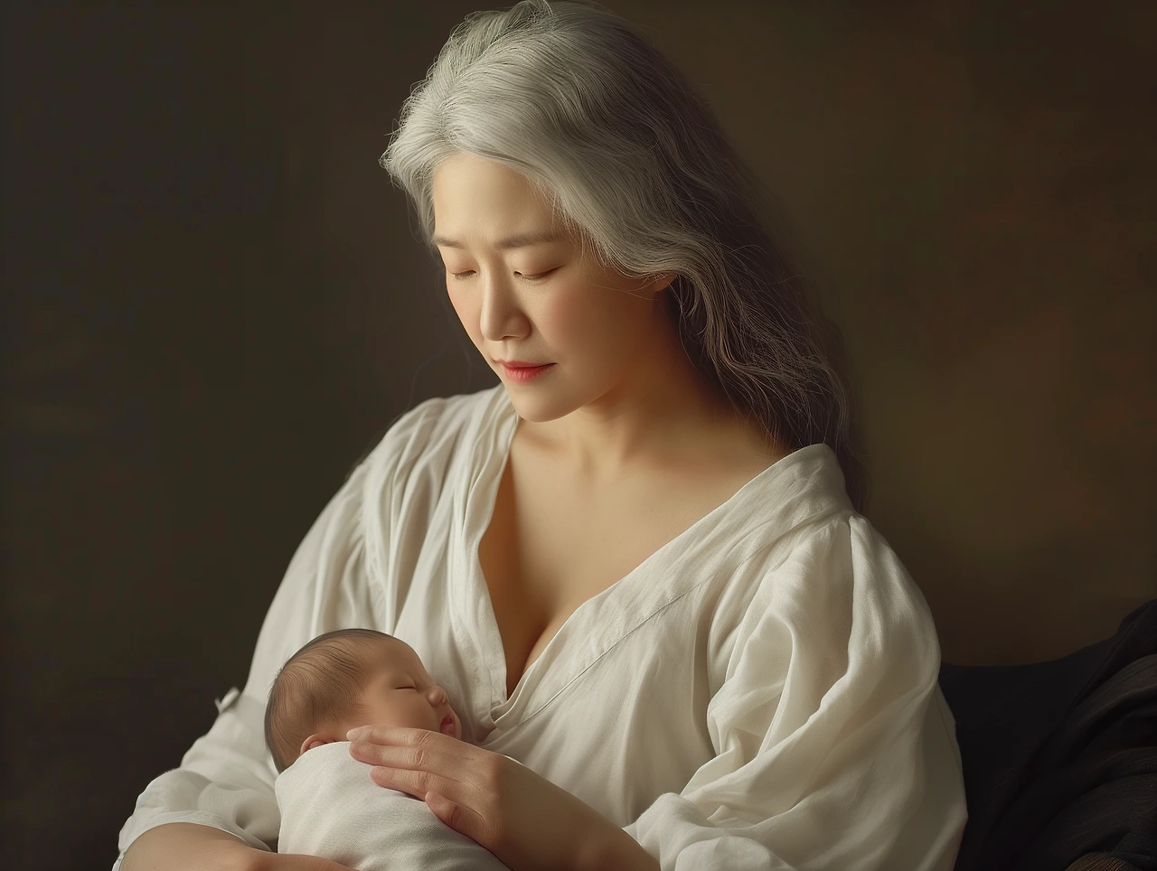 백발의 할머니 한 분이 고개를 숙이고 아기에게 모유 수유를 하고 있었다...