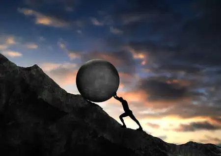 신의 노여움을 받아 매일같이 돌덩이를 정상에 올리지만 굴러 떨어지는 돌덩이를 다시 옮기는 작업을 반복하는 시지프.