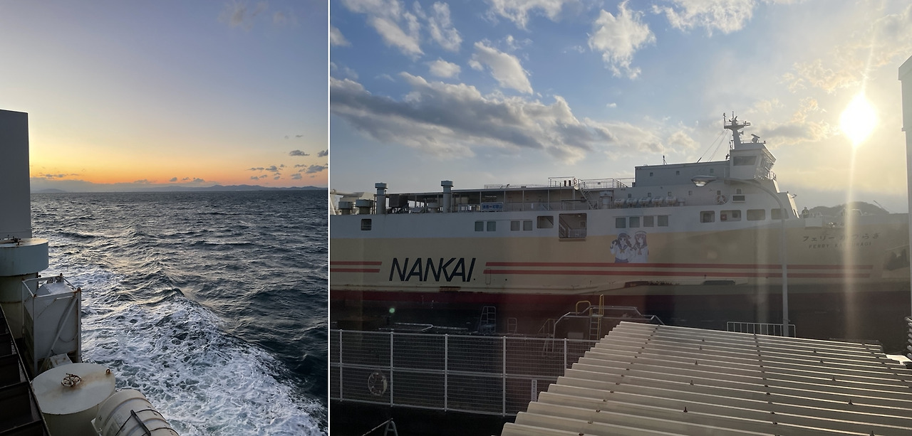 시간은 잘 갔고, 무사히 승선을 마쳤다. 배 이곳저곳을 둘러보고 배에서 바다 먼 곳으로 떨어지는 석양을 보며 감탄도 하며 다음 일정도 보며 역시 시간은 잘 흘렀고 생각보다 2시간 20분이라는 운행시간은 빠르게 갔다. 하선을 하고 앞에 사람들을 따라가니 자연스레 지하철역의 개찰구 앞이었고 약 1시간을 더 가면 숙소가 있는 신이마미야역까지 도착을 할 수 있었다. 전철을 타고 한 30분쯤 지났을까? 간사이공항 근처에 있는 역을 통과하는 시간이 집에서 나와 12시간이 흐른 뒤에 지나가고 있는 모습을 보니 새삼 돈이 좋다는 생각이 들더라. '돈을 더 주고 간사이국제공항으로 들어왔으면 6시간은 아낄 수 있었을 텐데'라는 생각도 들었지만 곧 긍정적인 생각으로 '재미있게 왔으면 됐지.'라는 생각으로 덮었다. 실제로 생각보다 재미있기도 했었다. 해외에서 내가 원하는 방향대로 대중교통을 이용해서 목적지에 도착한다는 부분이 뿌듯함으로 다가왔기 때문이다.