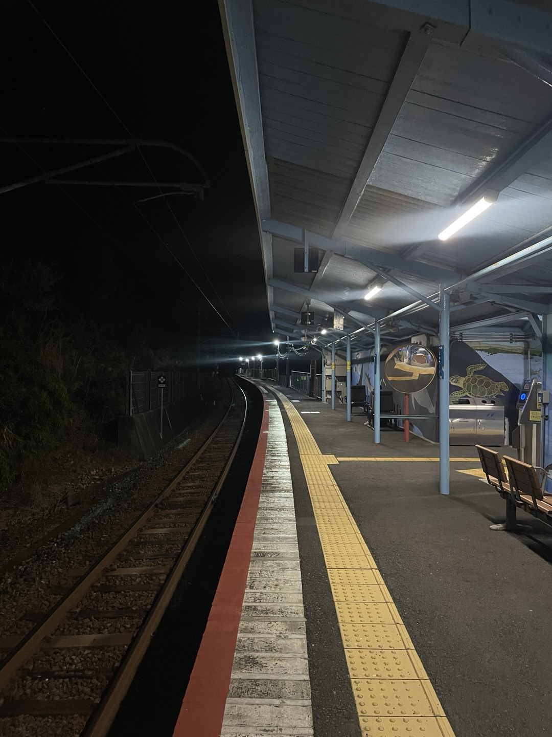 알다시피 다이지역은 역무원이 없는 역이다. 플랫폼도 단 1개뿐이다. 고래 박물관에서 무료 셔틀버스로 6명이 함께 다이지역에 하차를 했는데 나를 제외한 5분은 로컬전철을 타고 떠나버렸다. 나는 아직 30분을 더 기다려서 고속열차를 타야 한다. 다이지역은 근처에 정말 뭐가 없다. 근처에 민가 몇 곳뿐이다. 고래 박물관을 빼고는 정말 올 이유가 전혀 없는 곳이다. 어느새 땅거미조차 사라진 곳에서 혼자 열차를 기다리는 시간은 조금 무서웠었다.(나중에 알고 보니 2년 전인 23년도에 6 정거장 떨어진 구시모토역에서 한국인 청년이 실종하는 사건이 있었다고 한다.) 내가 타야 할 열차의 탑승시간이 다가오니 다른 승객 1,2분 와서 무난히 플랫폼으로 올라갈 수 있었다. 엘리베이터를 타고 올라갔는데 2층에 도착을 하니 비상벨 소리가 요란하게 울리는 것이 아닌가. 굉장히 놀라고 무서웠지만 문은 열려서 다행히 내릴 수 있었고, 한동안 저편에서 계속 울렸었다. 다행히 고속열차가 제시간에 맞춰 들어왔고 3시간 30분을 달려 덴노지역에 도착할 수 있었다.