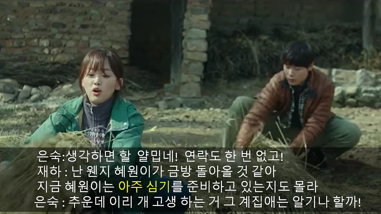 혜원은 추워서 문 닫으러 나가는 재하의 발을 걸고 재하는 혜원의 목을 조르고 두 사람이 깔깔거리고 장난을 치는 것을 은숙이 봐 버리고 은숙얼음!