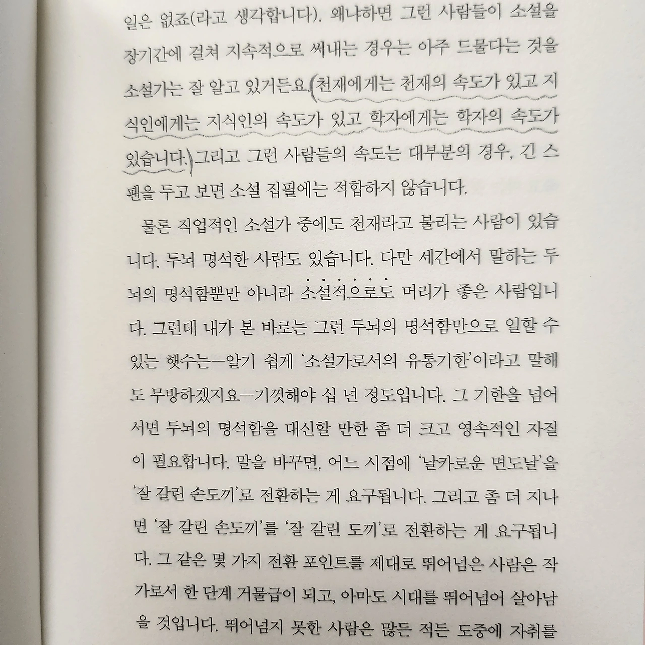 천재에게는 천재의 속도가 있고 지식인에게는 지식인의 속도가 있고 학자에게는 학자의 속도가 있습니다. p.27 직업으로서의 소설가 | 무라카미 하루키 | 현대문학