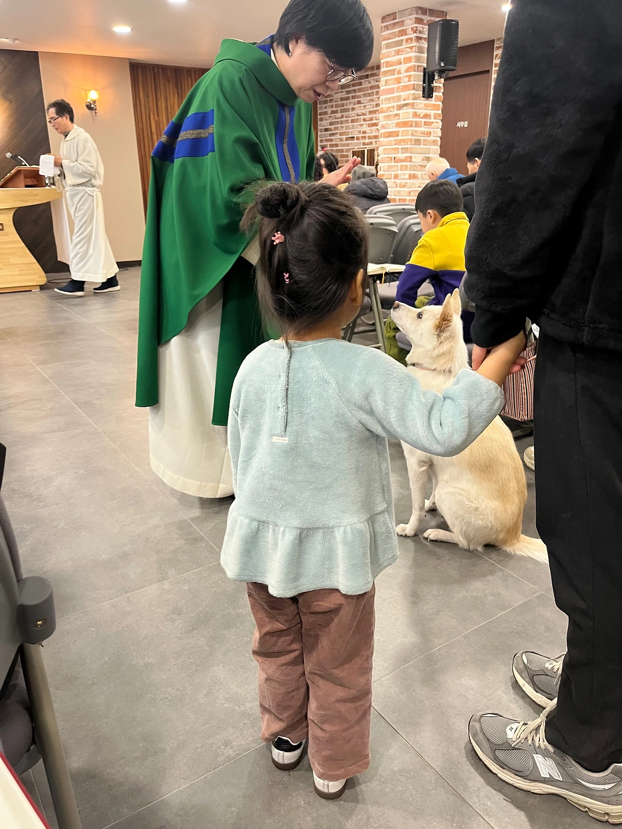 그렇다. 성공회대학교 대학원에서 동물권을 공부하신다는 특이한 신부님의 신념대로, 이 교회는 예배 때 반려동물과 함께 예배드릴 수 있다. 영성체 마지막 시간에 동물을 데리고 나가면 신부님이 저렇게 축복기도를 해주신다. 신부님도 두 고양이의 집사시다.