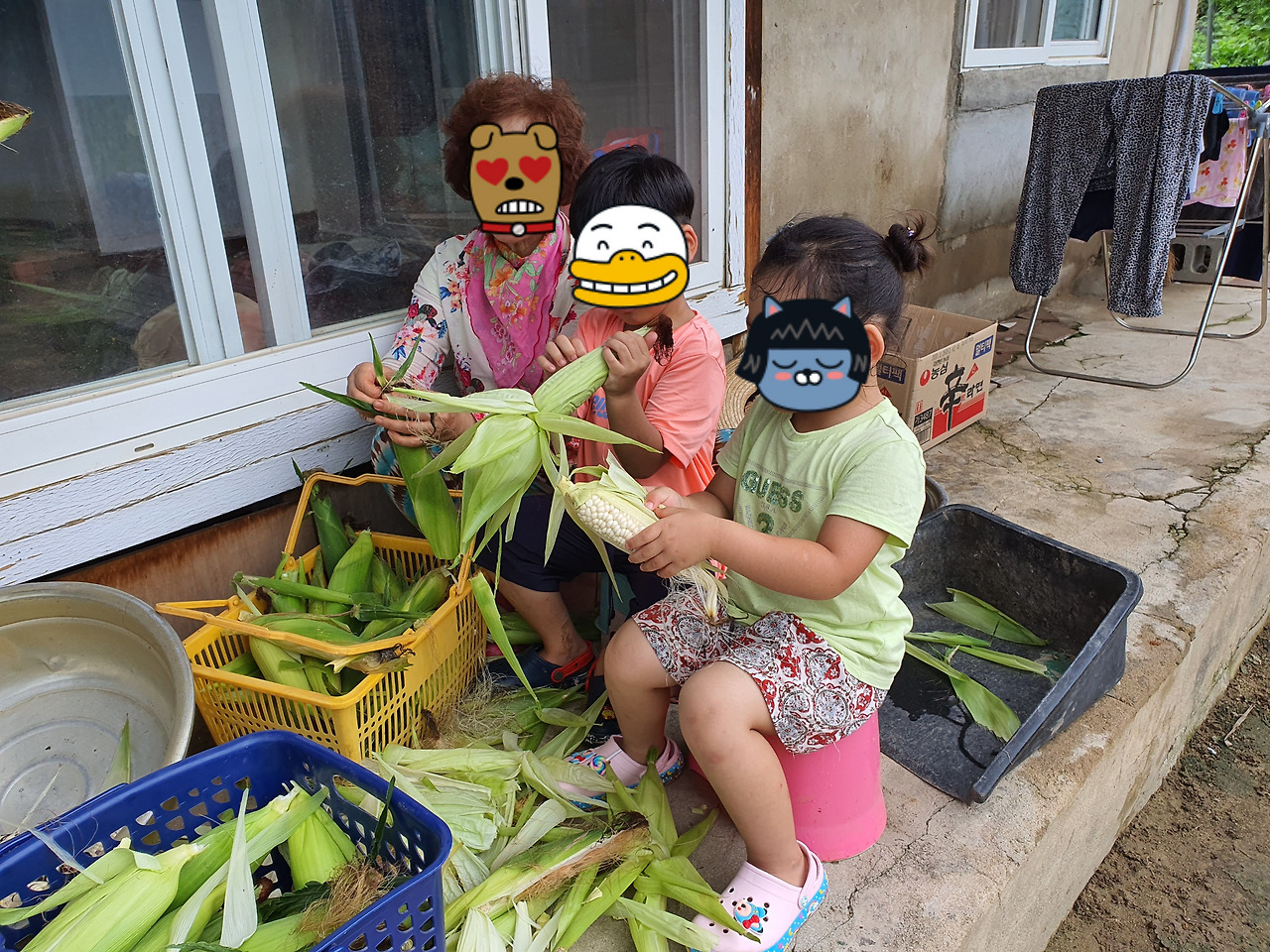 옥수수 수확해서 껍질까기, 낚시로 물고기잡기,식물관찰
