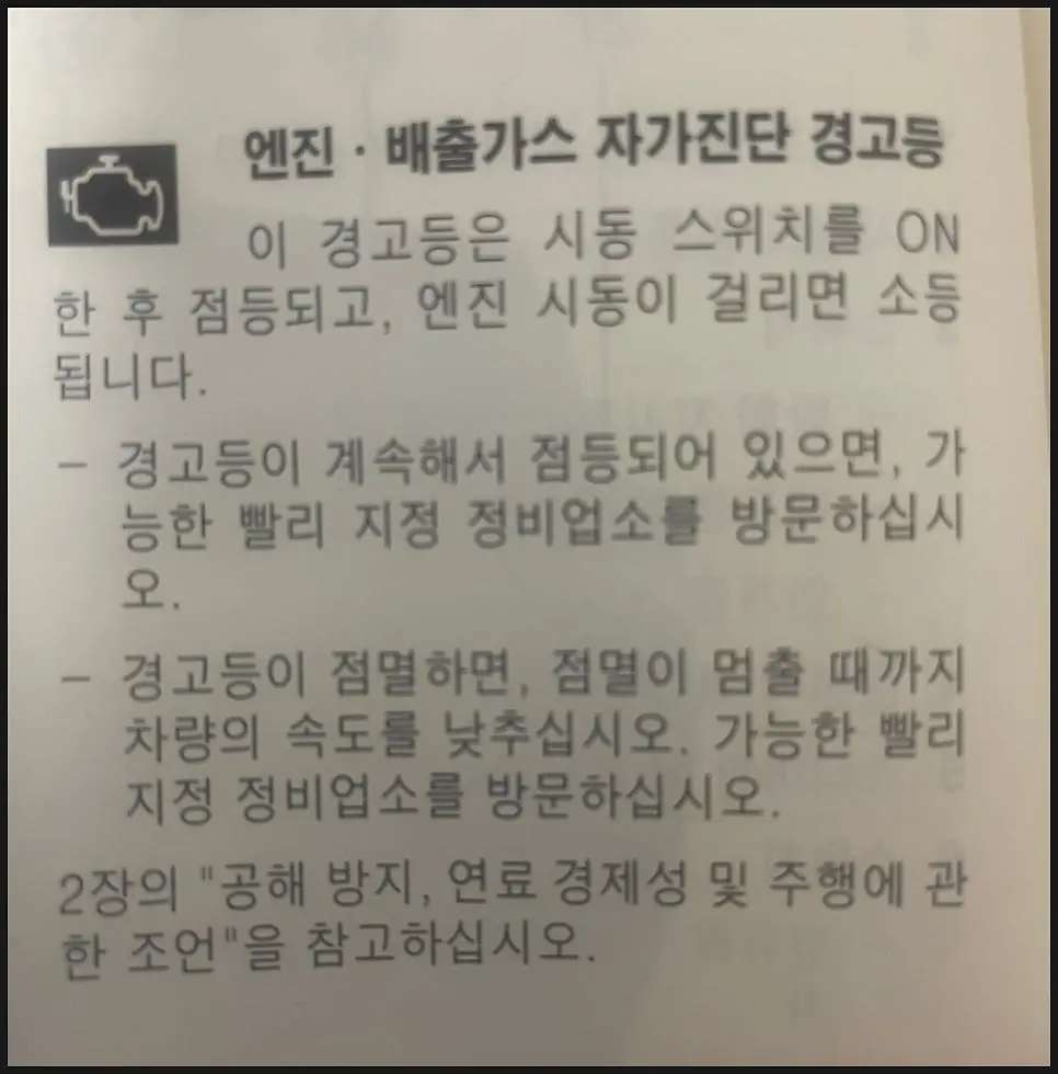 마지막 문장대로 '2장의 공해 방지, 연료 경제성 및 주행에 관한 조언'도 찾아봤지만, 역시 결국엔 배출가스 감지 관련 부품 고장 가능성이 있으니, "가능한 한 빨리 지정 정비소에 가서 점검을..."이라고 돼 있었습니다.