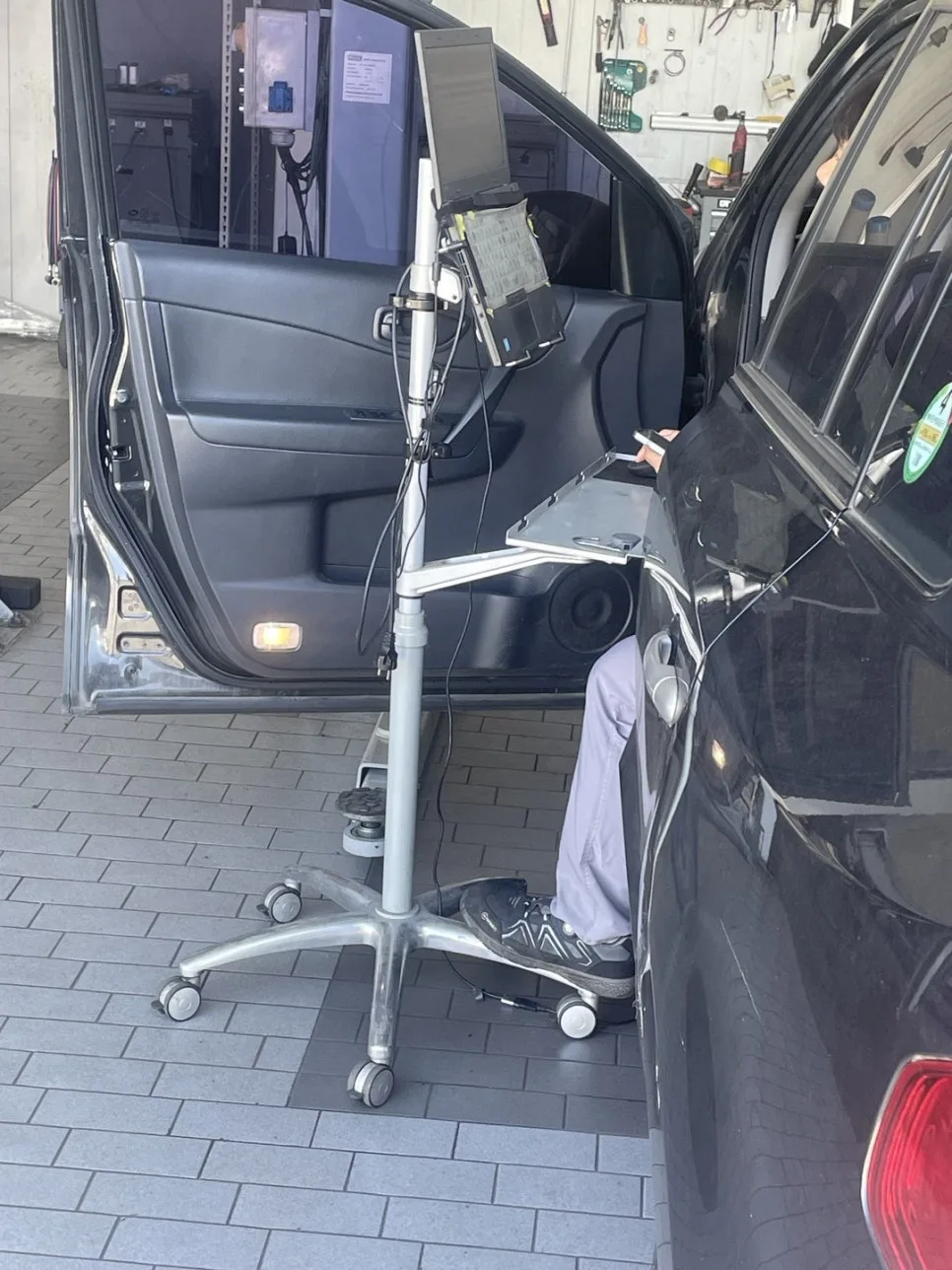 정비사님이 컴퓨터와 연결된 이런저런 선과 모니터가 매달린 바퀴 달린 막대기로 점검을 시작했습니다.