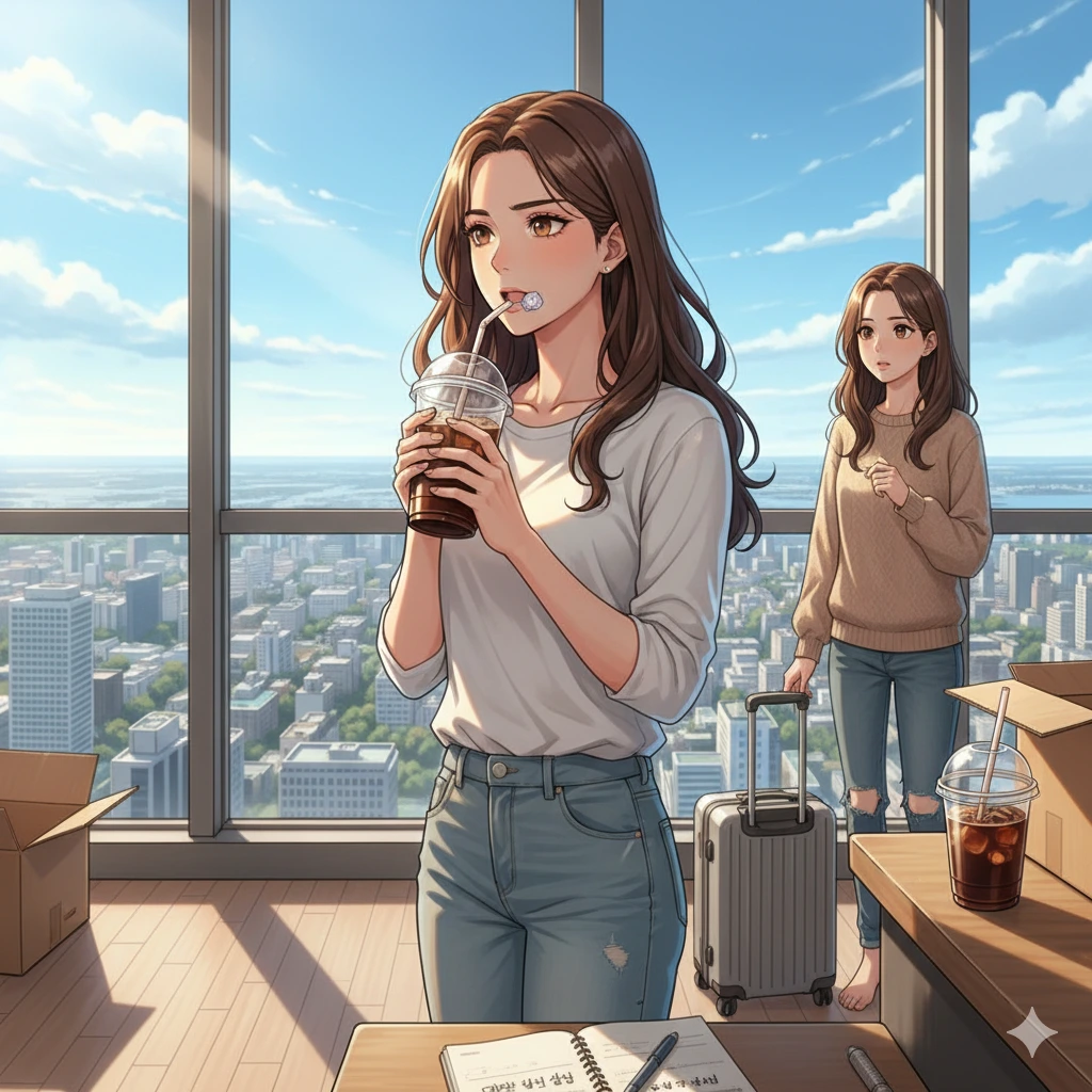 오피스텔의 두꺼운 통창은 도시의 소음을 완벽히 차단하고 있었지만, 말자의 귓가에는 여전히 "학생"이라 부르던 직원의 목소리가 이명처럼 맴돌았다. 말자는 소파에 깊숙이 몸을 파묻는 대신, 아직 풀지 않은 짐가방 옆에 꼿꼿이 서서 손에 든 아메리카노를 응시했다. 투명한 플라스틱 컵 벽면을 타고 흘러내린 물방울이 손가락 사이를 적셨다. 70년을 묵혀온 갈증이 가시고 나자, 비로소 날 선 현실이 해일처럼 밀려왔다.