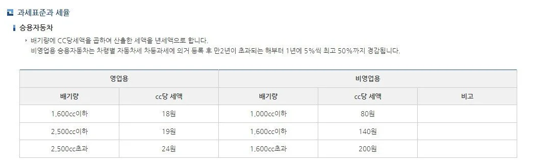 국내의 경우 엔진의 배기량(cc)를 기준으로 자동차세를 과세하고 있고, 비영업용 차량과 영업용 챠량으로 구분됩니다. 비영업용 차량은 엔진 cc당 1,500cc 이하 18원, 2,500cc이하 19원, 2,500cc 초과 24원이 부과되며, 영업용 차량의 경우 1,000cc 이하 80원, 1,600cc 이하 140원, 1,600cc 초과 200원이 기준 세액이 됩니다. 여기에 기준 세액의 30%인 지방교육세를 더해주면 1년 치 세금을 확인할 수 있습니다.