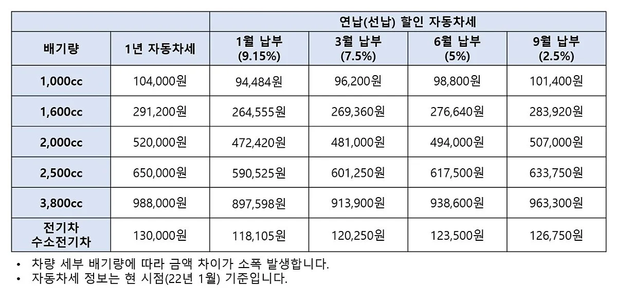 기본적으로 자동차세는 1년 세액을 1/2로 분할하여 6월과 12월달의 1일 날 소유주에게 정기분 납부로 부과됩니다. 하지만 1년치 세금을 한번에 연납(선납)하는 경우 납부 기간에 따라 할인 혜택을 제공합니다. 1월 중(16일~31일)까지 신고납부 하는 경우 연 세액의 9.15%, 3월 중(16일~31일)까지 신고 납부하는 경우에는 7.5%를 할인해줍니다. 또한 6월 중(16~30일)에는 5%, 9월 중(16~30일)에는 2.5%를 공제한 금액으로 신고 납부할 수 있습니다.