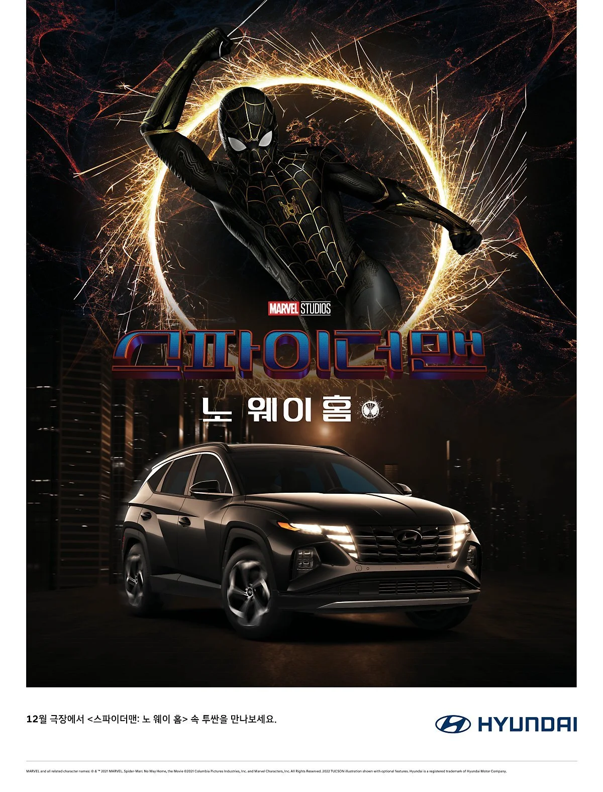 스파이더맨: 노 웨이 홈은 현대자동차가 등장하는 가장 최신 영화입니다. 지난해 5월 ‘소니 픽쳐스 엔터테인먼트’와 전략적 파트너십을 맺은 현대자동차는 영화는 물론 다양한 분야에서 협업을 진행해 오고 있습니다. 양사 파트너십의 첫 번째 작품인 스파이더맨: 노 웨이 홈은 세계적으로 큰 인기를 모으고 있는 스파이더맨 시리즈의 3번째 영화로, 지난 8월 공개된 첫 예고편은 공개 하루 만에 조회 수 3억 5,500만을 돌파하며 역대 영화 예고편 최고 기록을 수립한 영화입니다.