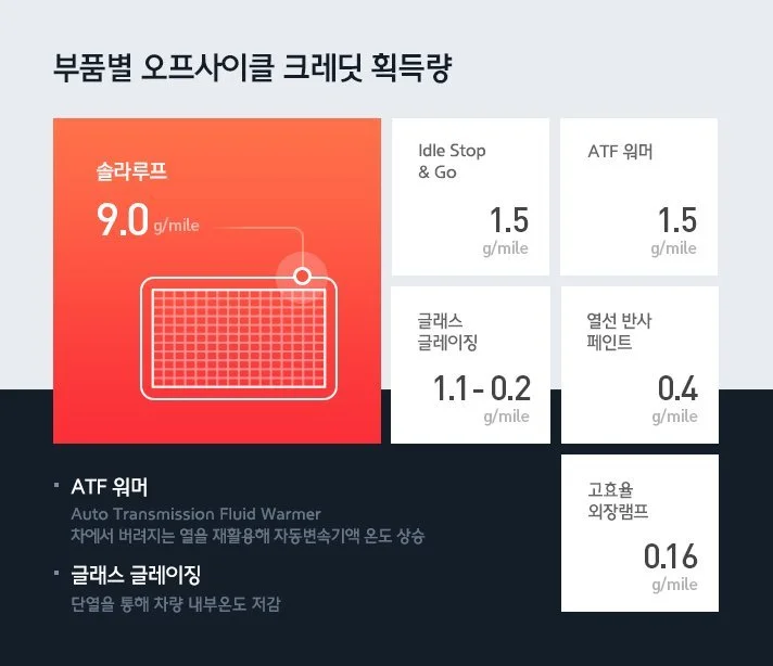 솔라루프는 단순히 수치만 놓고 본다면 아직 시작 단계라고 할 수도 있습니다. 하지만 미국 시장에서 환경에 긍정적인 영향을 주는 부품에 제공하는 오프 사이클 크래딧을 통해 친환경성을 인정받기도 했습니다. 고효율 램프는 마일당 0.16g, 아이들 스탑&고 시스템은 마일당 1.5g의 이산화탄소 배출량을 감소하는데, 솔라루프는 마일당 9g의 월등한 크래딧을 확보한 덕분입니다.